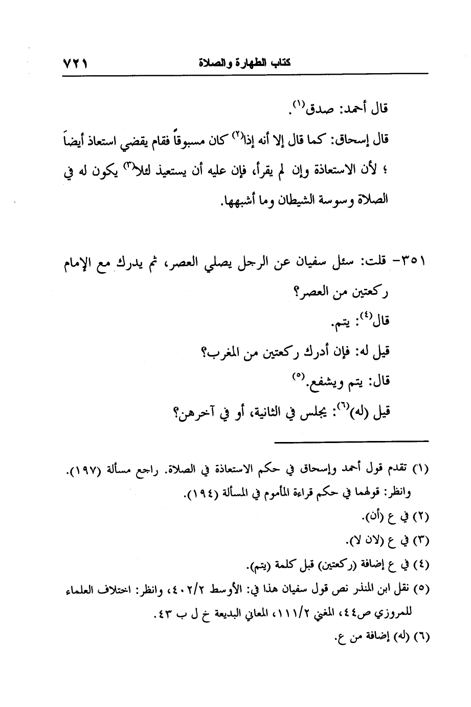 1 تقدم قول أحمد وإسحاق في حكم الاستعاذة في الصلاة. راجع مسألة (197) . وانظر: قولهما في حكم قراءة المأموم في المسألة (194) .
