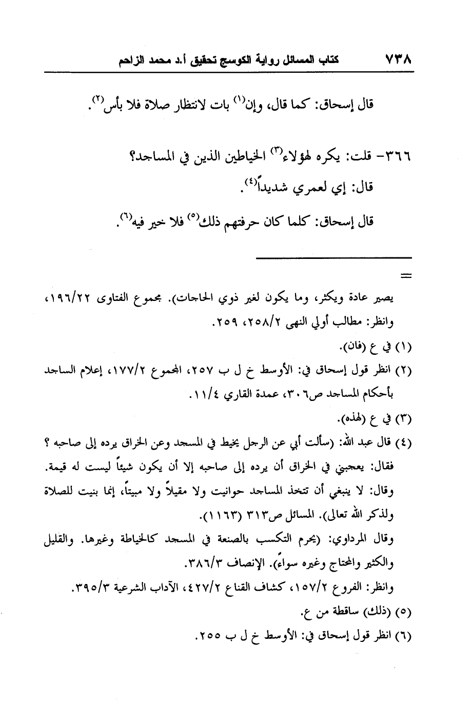4 قال عبد الله: (سألت أبي عن الرجل يخيط في المسجد وعن الخراق يرده إلى صاحبه؟ فقال: يعجبني في الخراق أن يرده إلى صاحبه إلا أن يكون شيئاً ليست له قيمة. وقال: لا ينبغي أن تتخذ المساجد حوانيت ولا مقيلاً ولا مبيتاً، إنما بنيت للصلاة ولذكر الله تعالى) . المسائل ص313 (1163) .
