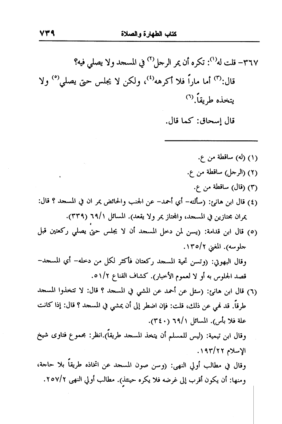 6 قال ابن هانئ: (سئل عن أحمد عن المشي في المسجد؟ قال: لا تتخذوا المسجد طرقاً. قد نهي عن ذلك، قلت: فإن اضطر إلى أن يمشي في المسجد؟ قال: إذا كانت علة فلا بأس) . المسائل 1/69 (340) .