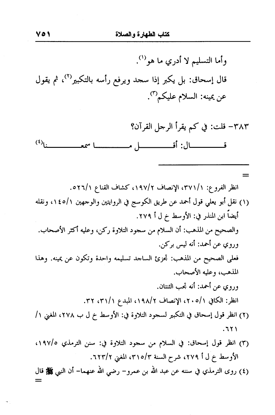 3 انظر قول إسحاق: في السلام من سجود التلاوة في: سنن الترمذي 5/197، الأوسط خ ل أ 279، شرح السنة 3/315، المغني 2/623.