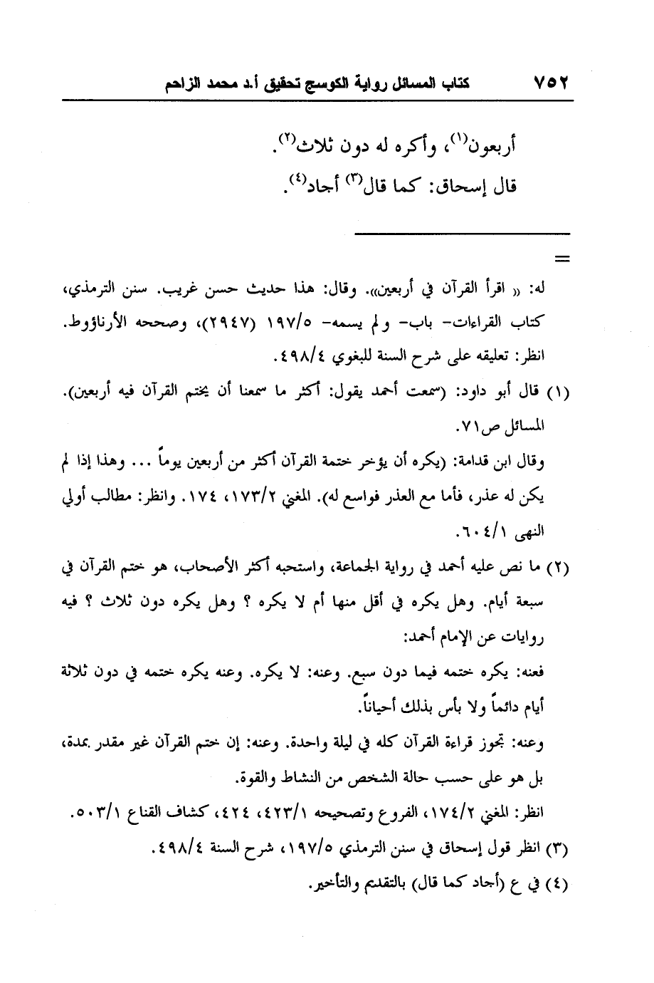 2 ما نص عليه أحمد في رواية الجماعة، واستحبه أكثر الأصحاب، هو ختم القرآن في سبعة أيام. وهل يكره في أقل منها أم لا يكره؟ وهل يكره دون ثلاث؟ فيه روايات عن الإمام أحمد: