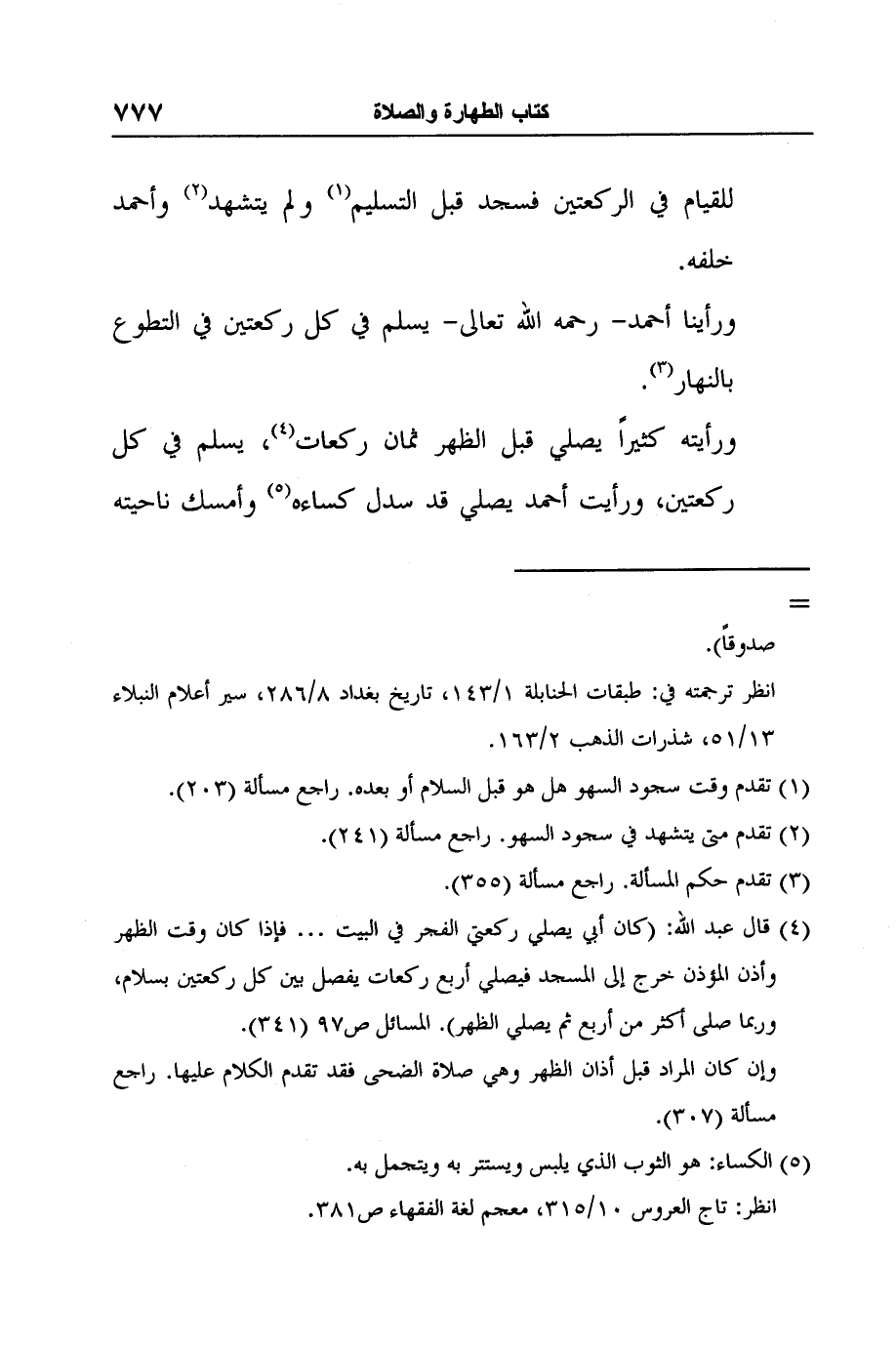 ورأيته كثيراً يصلي قبل الظهر ثمان ركعات4، يسلم في كل ركعتين، ورأيت أحمد يصلي قد سدل كساءه5 وأمسك ناحيته