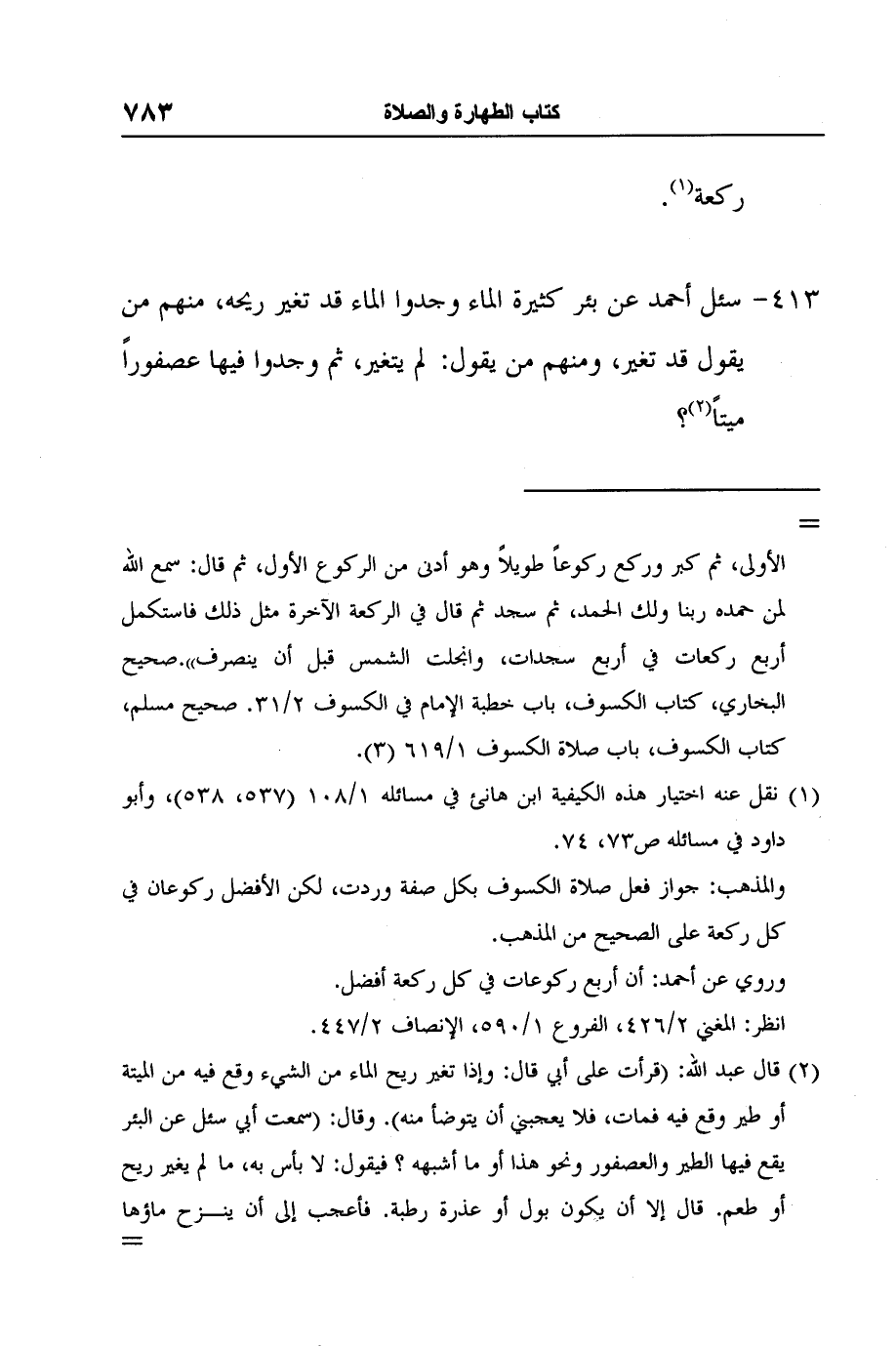 [413-] سئل أحمد عن بئر كثيرة الماء وجدوا الماء قد تغير ريحه، منهم من يقول قد تغير، ومنهم من يقول: لم يتغير، ثم وجدوا فيها عصفوراً ميتاً2؟