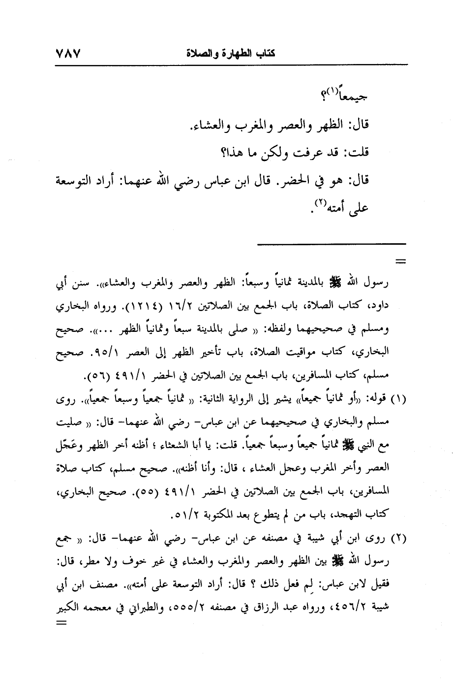 2 روى ابن أبي شيبة في مصنفه عن ابن عباس- رضي الله عنهما- قال: "جمع رسول الله صلى الله عليه وسلم بين الظهر والعصر والمغرب والعشاء في غير خوف ولا مطر، قال: فقيل لابن عباس: لِم فعل ذلك؟ قال: أراد التوسعة على أمته". مصنف ابن أبي شيبة 2/456، ورواه عبد الرزاق في مصنفه 2/555، والطبراني في معجمه الكبير 1/397 (10803) ، ورواه أحمد في المسند بلفظ: (يا أبا عباس ما أراد بذلك؟ قال: التوسع على أمته) . المسند 1/346.