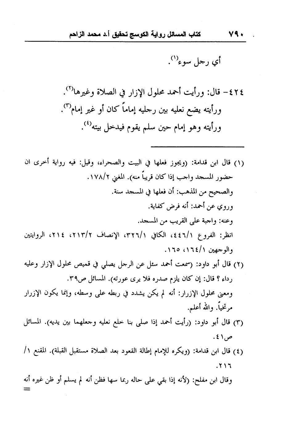 [424-] قال: ورأيت أحمد محلول الإزار في الصلاة وغيرها2.
