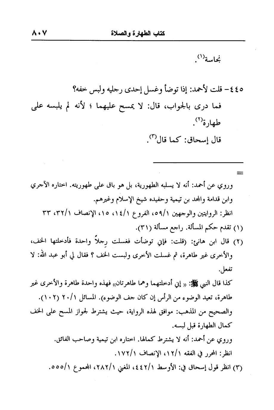 2 قال ابن هانئ: (قلت: فإني توضأت فغسلت رِجلاً واحدة فأدخلتها الخف، والأخرى غير طاهرة، ثم غسلت الأخرى ولبست الخف؟ فقال لي أبو عبد الله: لا تفعل.