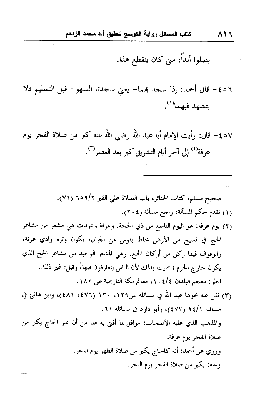 [457-] قال: رأيت الإمام أبا عبد الله رضي الله عنه كبر من صلاة الفجر يوم عرفة2 إلى آخر أيام التشريق كبر بعد العصر3.