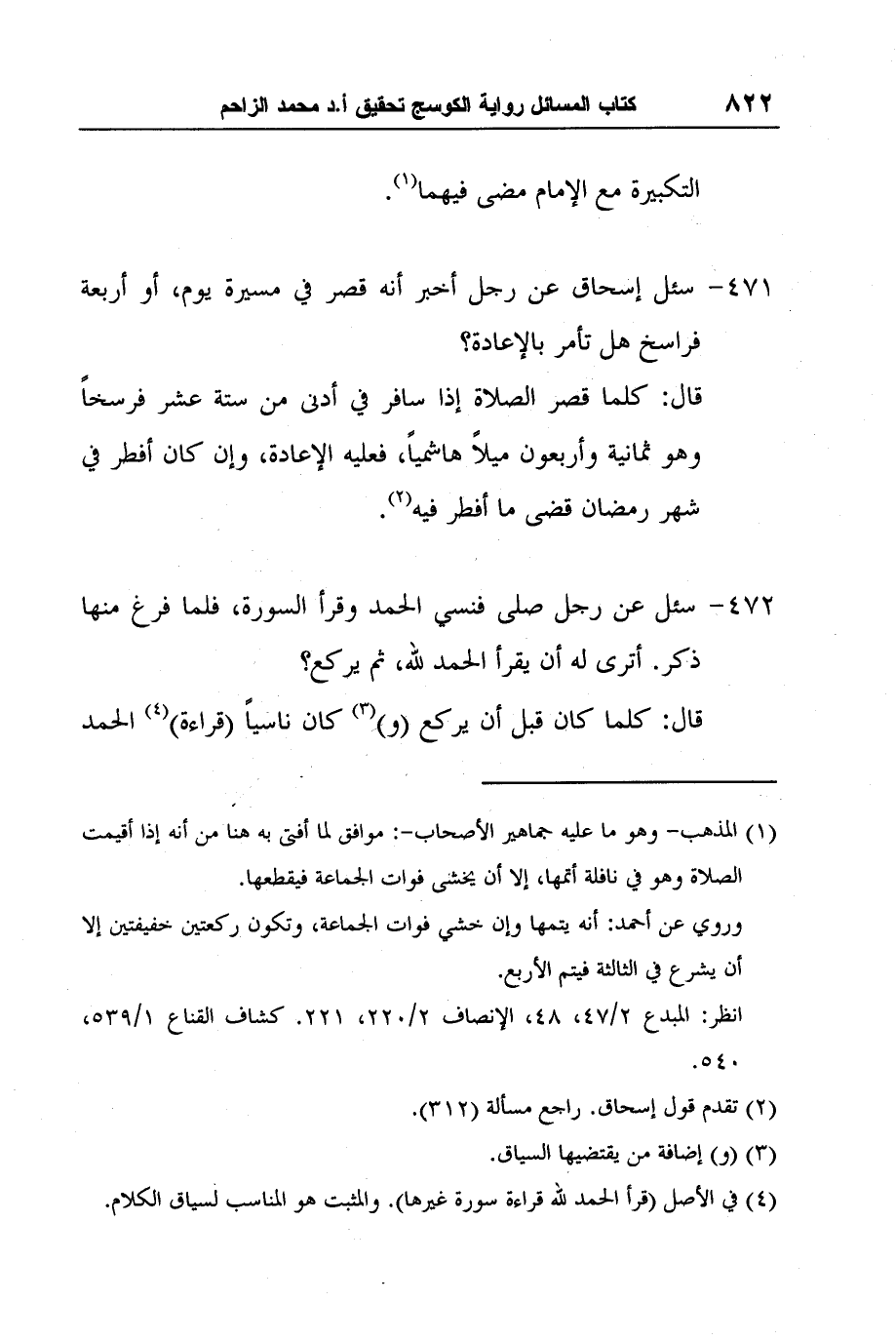 [471-] سئل إسحاق عن رجل أخبر أنه قصر في مسيرة يوم، أو أربعة فراسخ هل تأمر بالإعادة؟