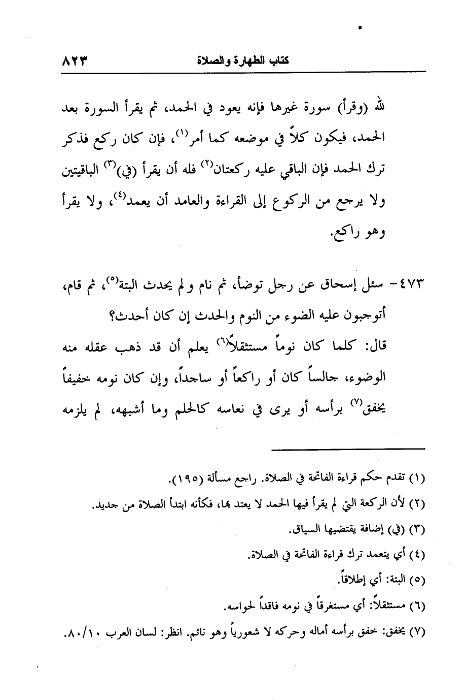 قال: كلما كان نوماً مستثقلاً6 يعلم أن قد ذهب عقله منه الوضوء، جالساً كان أو راكعاً أو ساجداً، وإن كان نومه خفيفاً يخفق7 برأسه أو يرى في نعاسه كالحلم وما أشبهه، لم يلزمه