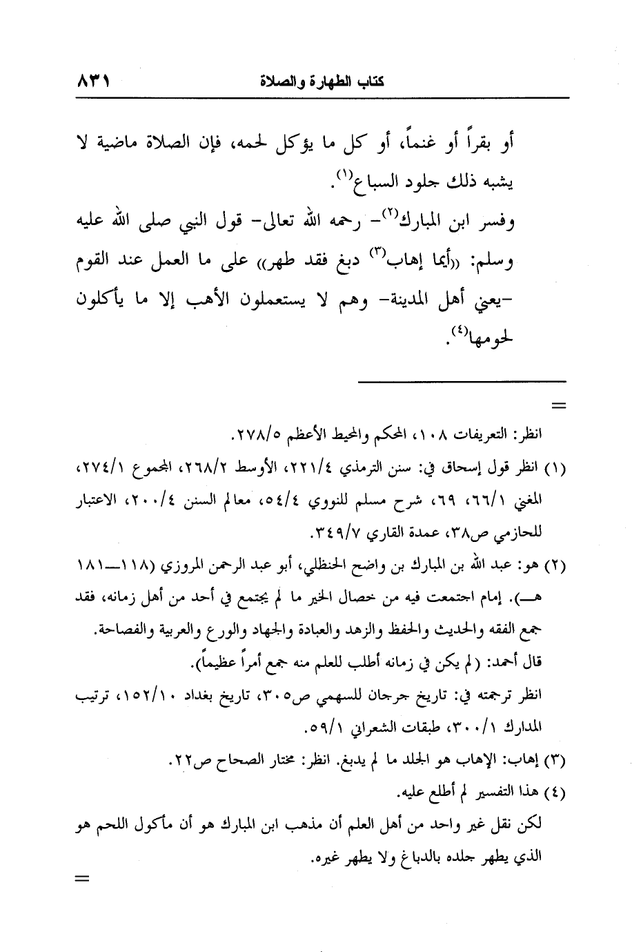 وفسر ابن المبارك2- رحمه الله تعالى- قول النبي صلى الله عليه وسلم: "أيما إهاب3 دبغ فقد طهر" على ما العمل عند القوم -يعني أهل المدينة- وهم لا يستعملون الأهب إلا ما يأكلون لحومها4.