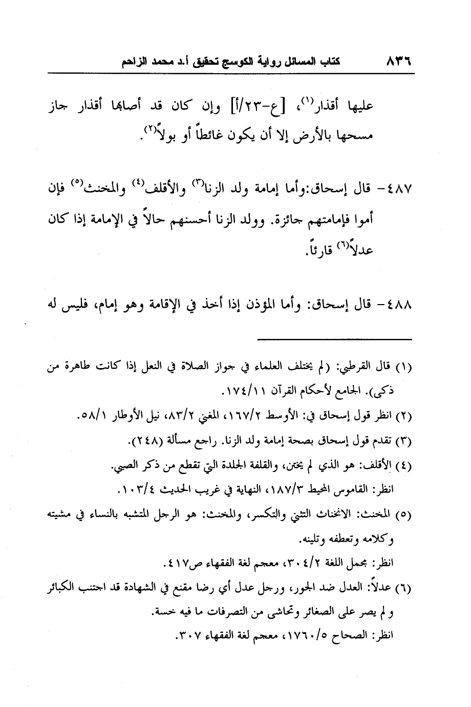 [487-] قال إسحاق: وأما إمامة ولد الزنا3 والأقلف4 والمخنث5 فإن أموا فإمامتهم جائزة. وولد الزنا أحسنهم حالاً في الإمامة إذا كان عدلاً6 قارئاً.