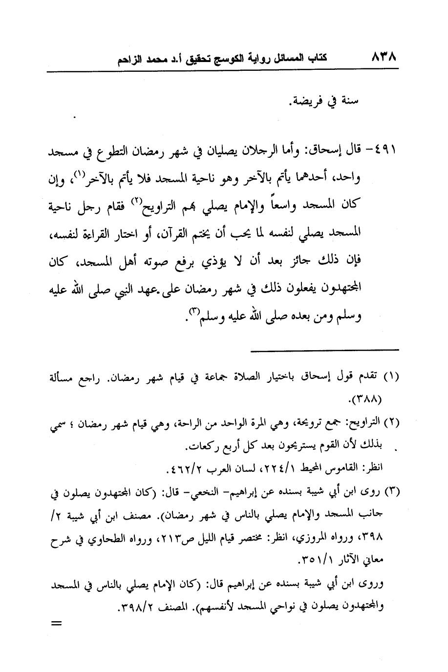 [491-] قال إسحاق: وأما الرجلان يصليان في شهر رمضان التطوع في مسجد واحد، أحدهما يأتم بالآخر وهو ناحية المسجد فلا يأتم بالآخر1، وإن كان المسجد واسعاً والإمام يصلي بهم التراويح2 فقام رجل ناحية المسجد يصلي لنفسه لما يحب أن يختم القرآن، أو اختار القراءة لنفسه، فإن ذلك جائز بعد أن لا يؤذي برفع صوته أهل المسجد، كان المجتهدون يفعلون ذلك في شهر رمضان على عهد النبي صلى الله عليه وسلم ومن بعده صلى الله عليه وسلم3.