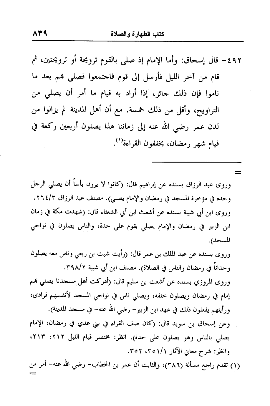 [492-] قال إسحاق: وأما الإمام إذ صلى بالقوم ترويحة أو ترويحتين، ثم قام من آخر الليل فأرسل إلى قوم فاجتمعوا فصلى بهم بعد ما ناموا فإن ذلك جائز، إذا أراد به قيام ما أمر أن يصلي من التراويح، وأقل من ذلك خمسة. مع أن أهل المدينة لم يزالوا من لدن عمر رضي الله عنه إلى زماننا هذا يصلون أربعين ركعة في قيام شهر رمضان، يخففون القراءة1.