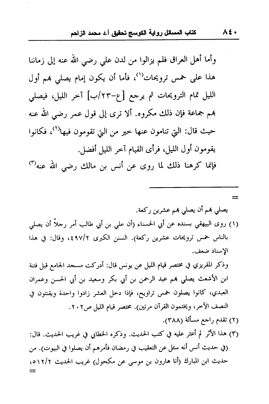 وأما أهل العراق فلم يزالوا من لدن علي رضي الله عنه إلى زماننا هذا على خمس ترويحات1، فأما أن يكون إمام يصلي بهم أول الليل تمام الترويحات ثم يرجع [ع-23/ب] آخر الليل، فيصلي بهم جماعة فإن ذلك مكروه. ألا ترى إلى قول عمر رضي الله عنه حيث قال: التي تنامون عنها خير من التي تقومون فيها2، فكانوا يقومون أول الليل، فرأى القيام آخر الليل أفضل.