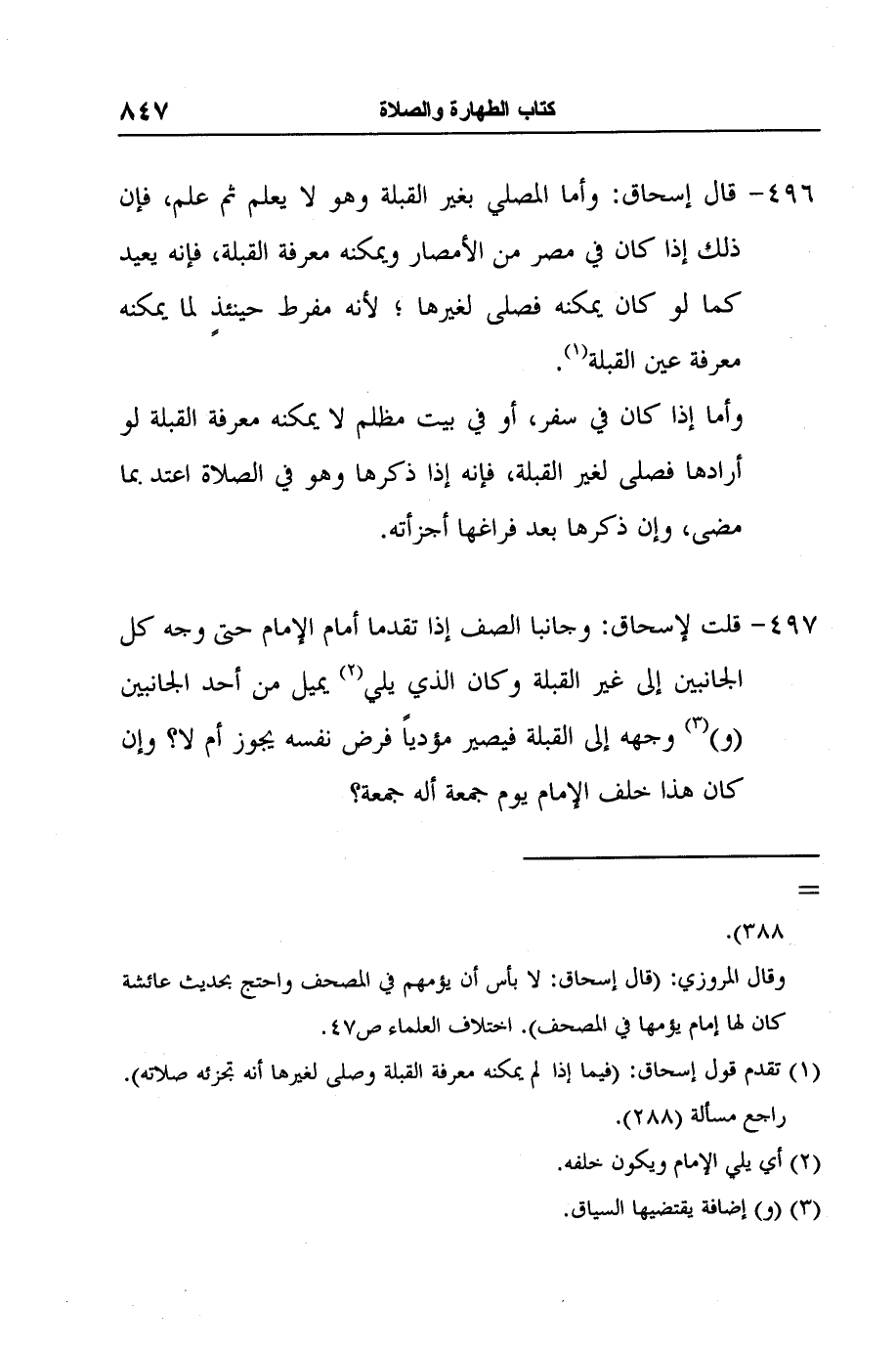 1 تقدم قول إسحاق: (فيما إذا لم يمكنه معرفة القبلة وصلى لغيرها أنه تجزئه صلاته) . راجع مسألة (288) .