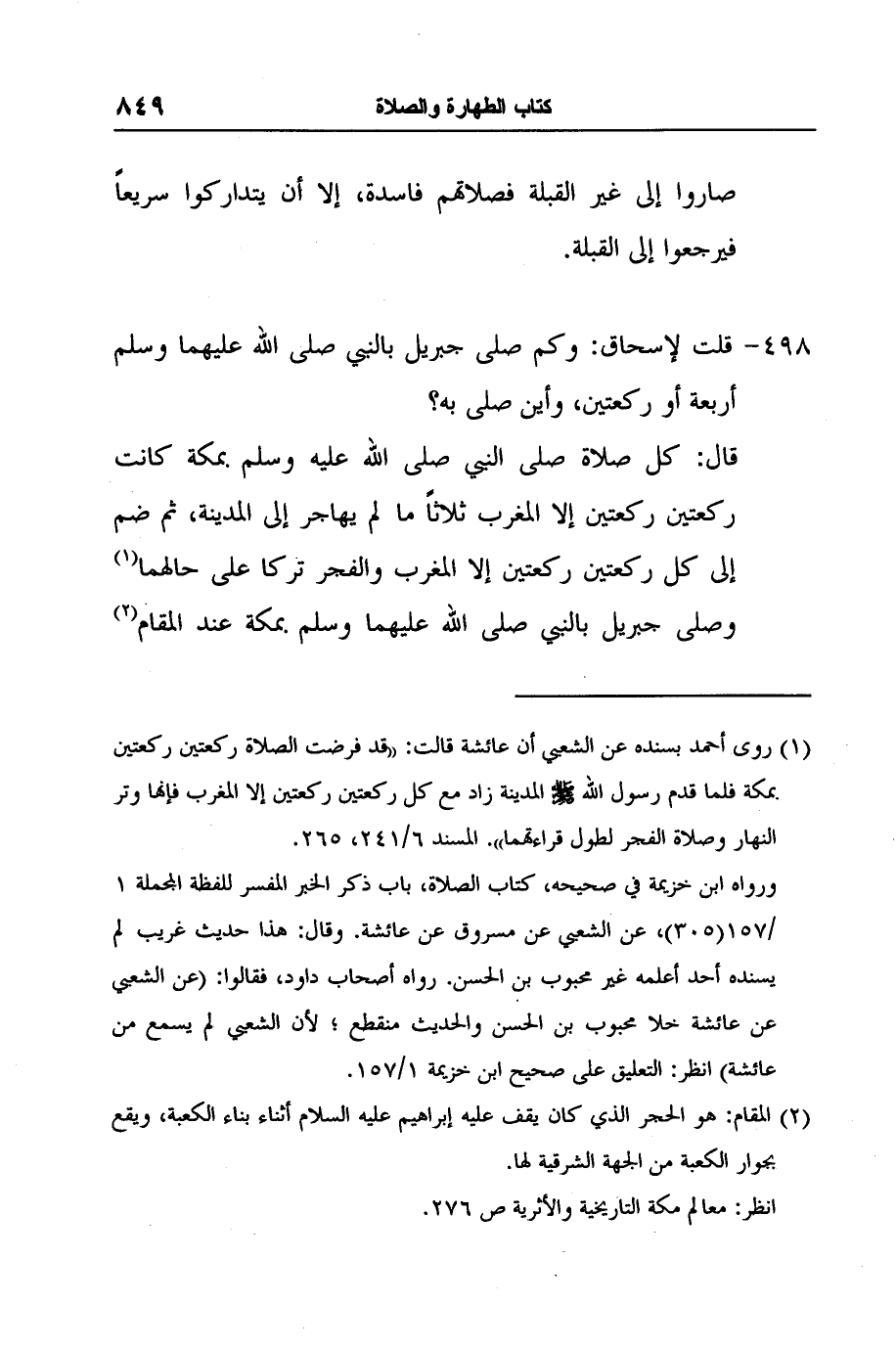 [498-] قلت لإسحاق: وكم صلى جبريل بالنبي صلى الله عليهما وسلم أربعة أو ركعتين، وأين صلى به؟