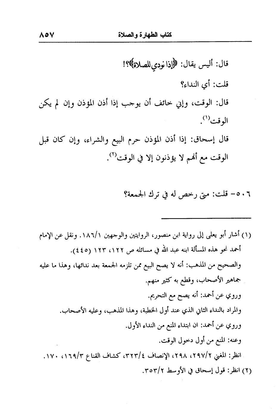 1 أشار أبو يعلى إلى رواية ابن منصور، الروايتين والوجهين 1/186. ونقل عن الإمام أحمد نحو هذه المسألة ابنه عبد الله في مسائله ص 122، 123 (445) .