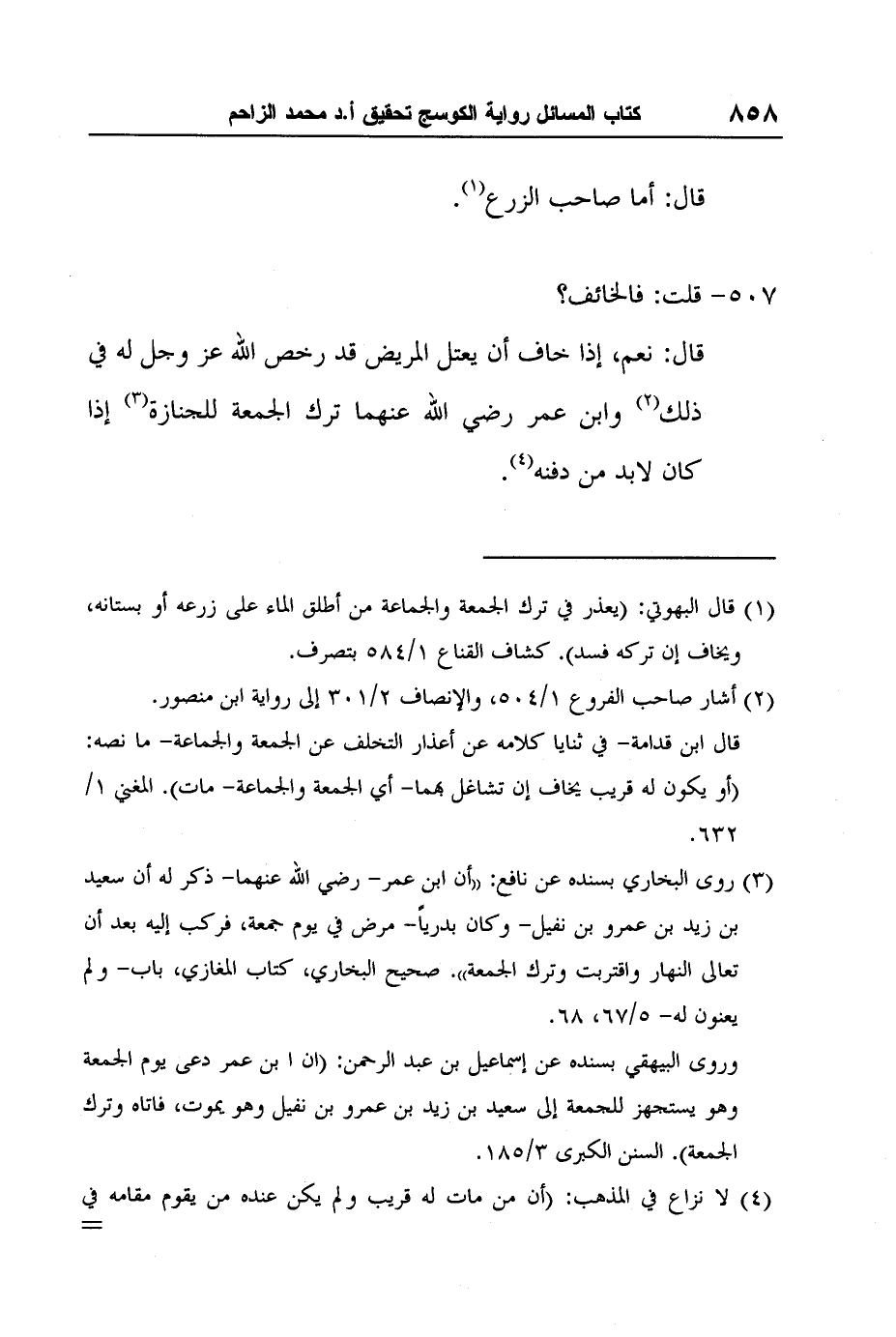 3 روى البخاري بسنده عن نافع: "أن ابن عمر- رضي الله عنهما- ذكر له أن سعيد بن زيد بن عمرو بن نفيل- وكان بدرياً- مرض في يوم جمعة، فركب إليه بعد أن تعالى النهار واقتربت وترك الجمعة". صحيح البخاري، كتاب المغازي، باب- ولم يعنون له- 5/67، 68.