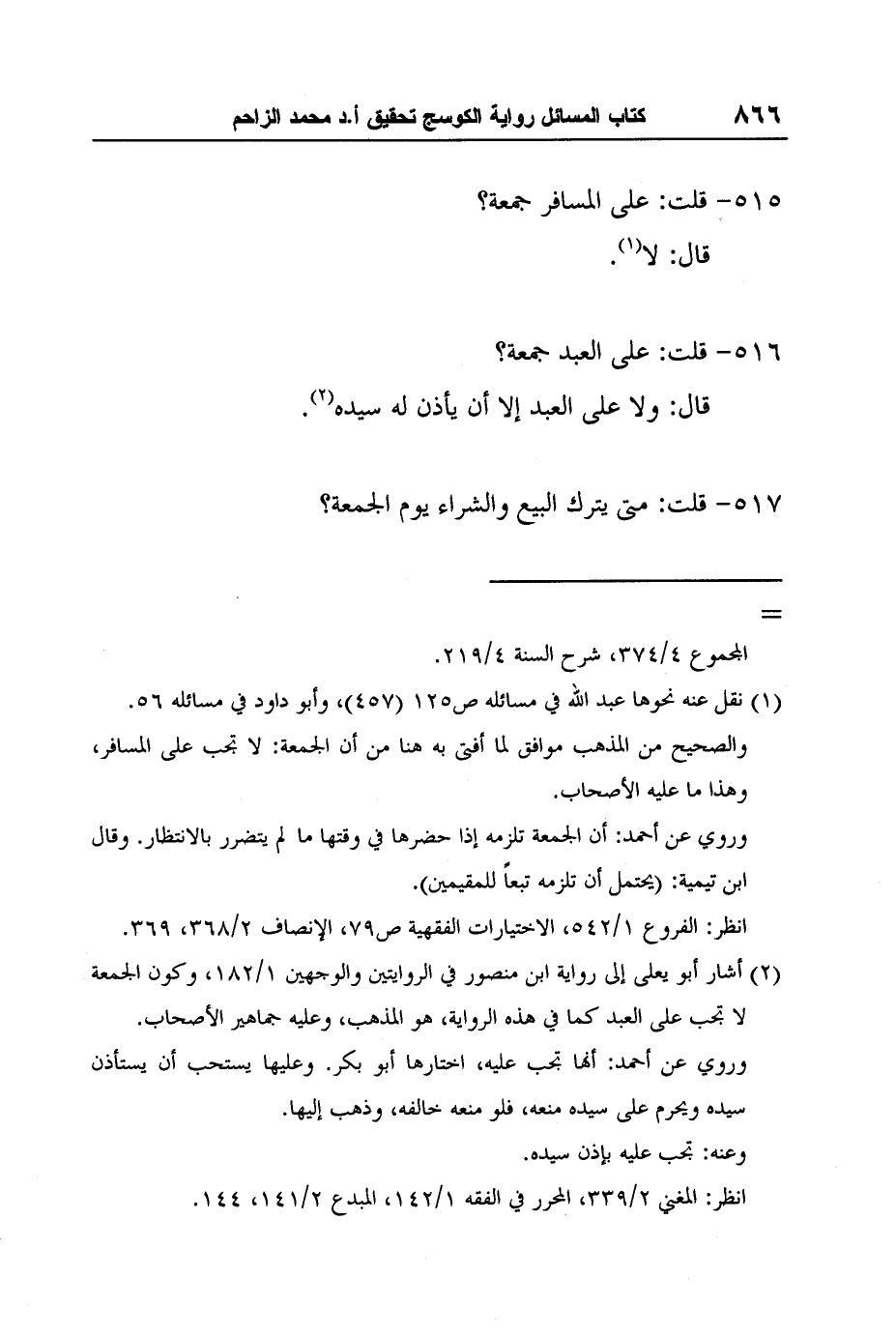 2 أشار أبو يعلى إلى رواية ابن منصور في الروايتين والوجهين 1/182، وكون الجمعة لا تجب على العبد كما في هذه الرواية، هو المذهب، وعليه جماهير الأصحاب.
