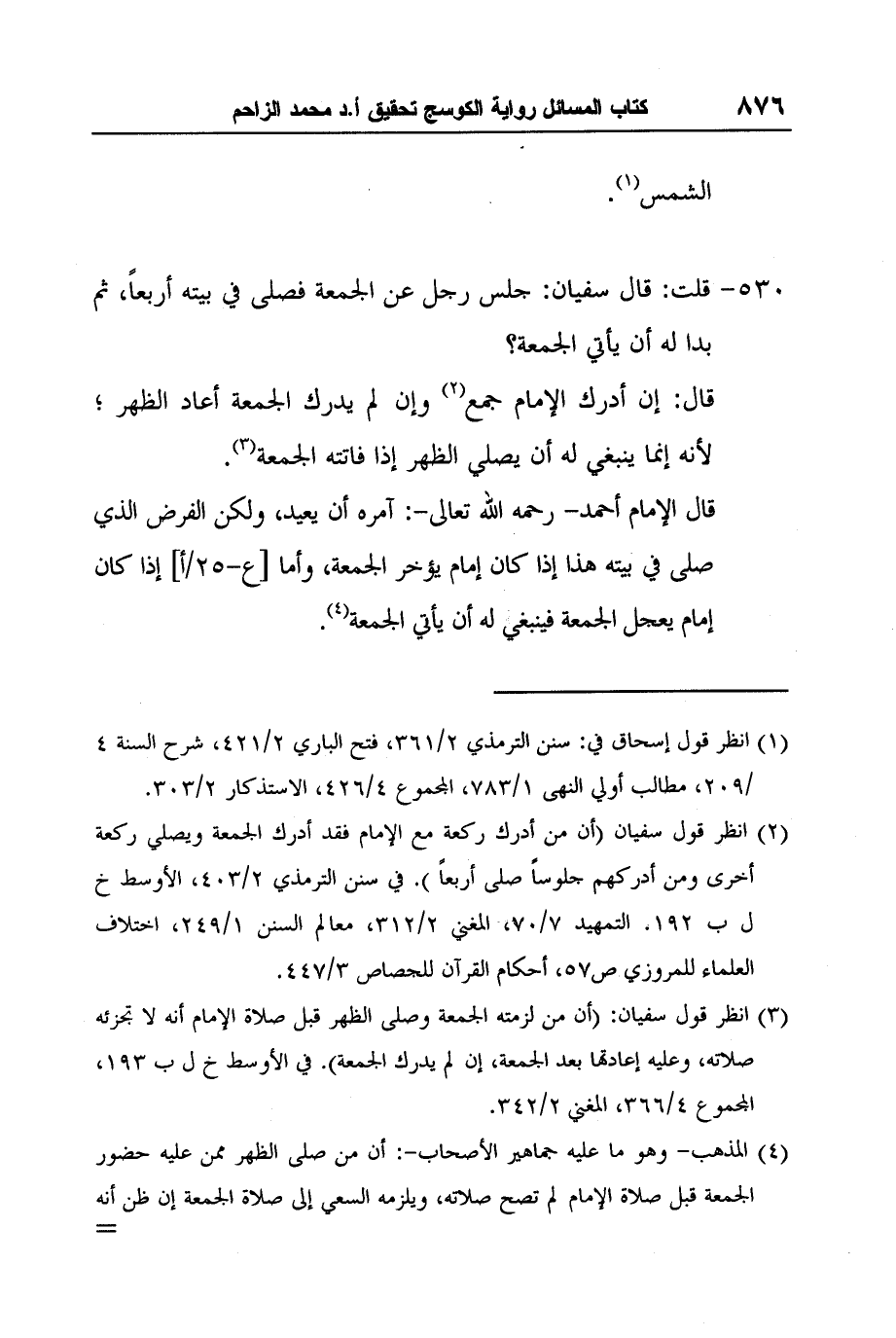 3 انظر قول سفيان (أن من أدرك ركعة مع الإمام فقد أدرك الجمعة ويصلي ركعة أخرى ومن أدركهم جلوساً صلى أربعاً) . في سنن الترمذي 2/403، الأوسط خ ل ب 192. التمهيد 7/70، المغني 2/312، معالم السنن 1/249، اختلاف العلماء للمروزي ص57، أحكام القرآن للجصاص 3/447.