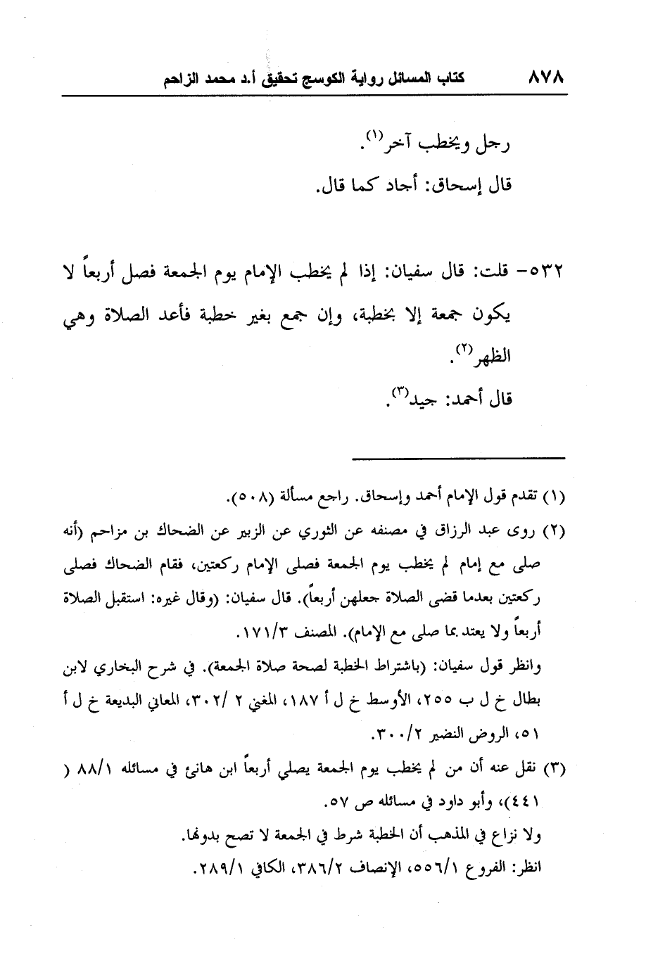 3 نقل عنه أن من لم يخطب يوم الجمعة يصلي أربعاً ابن هانئ في مسائله 1/88 (441) ، وأبو داود في مسائله ص 57.