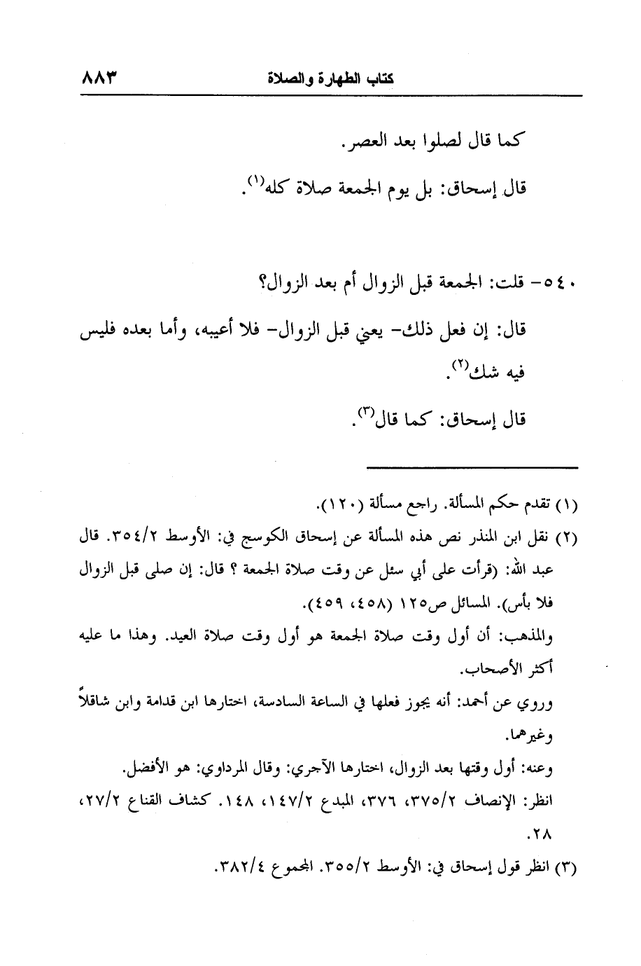 2 نقل ابن المنذر نص هذه المسألة عن إسحاق الكوسج في: الأوسط 2/354. قال عبد الله: (قرأت على أبي سئل عن وقت صلاة الجمعة؟ قال: إن صلى قبل الزوال فلا بأس) . المسائل ص125 (458، 459) .