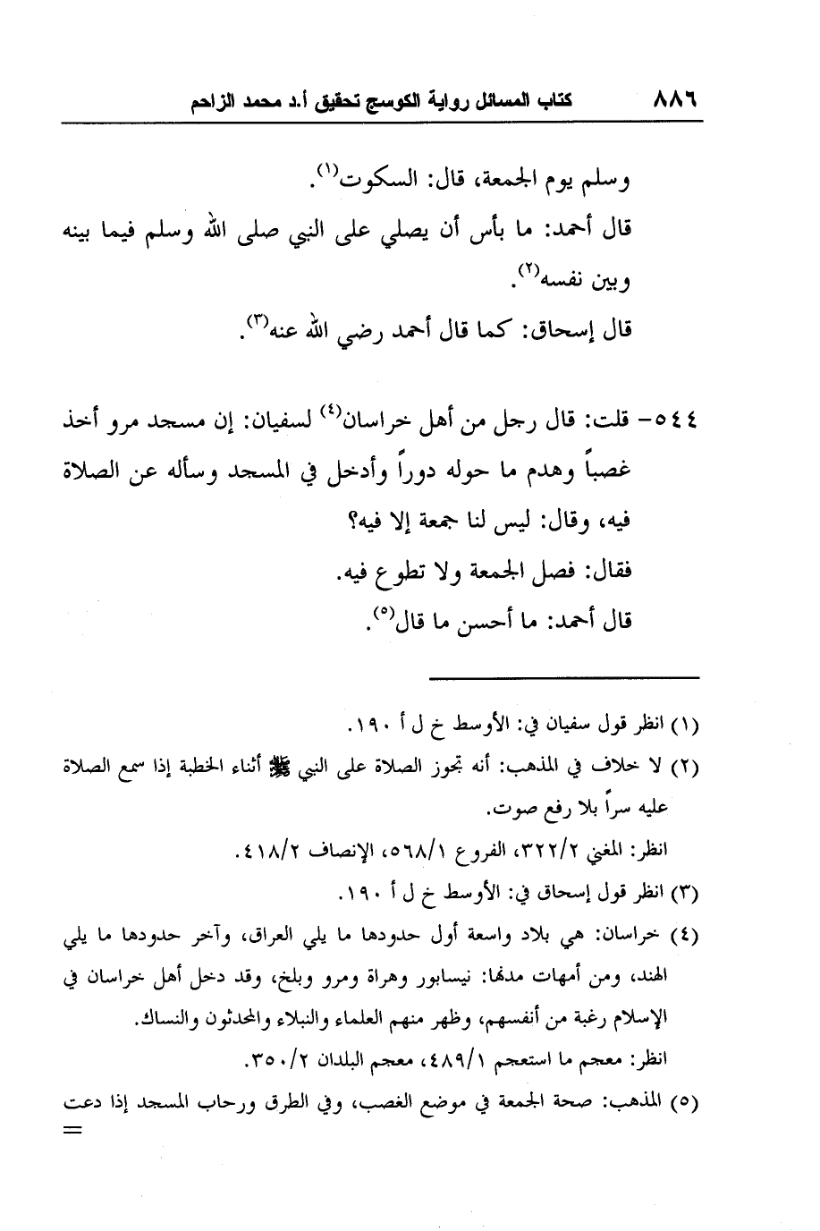 [544-] قلت: قال رجل من أهل خراسان4 لسفيان: إن مسجد مرو أخذ غصباً وهدم ما حوله دوراً وأدخل في المسجد وسأله عن الصلاة فيه، وقال: ليس لنا جمعة إلا فيه؟