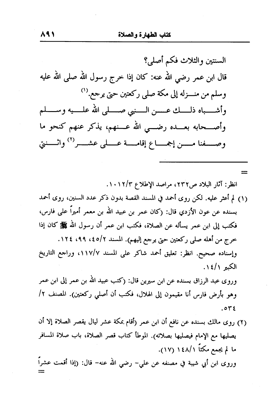 1 لم أعثر عليه. لكن روى أحمد في المسند القصة بدون ذكر عدد السنين، روى أحمد بسنده عن عون الأزدي قال: "كان عمر بن عبيد الله بن معمر أميراً على فارس، فكتب إلى ابن عمر يسأله عن الصلاة، فكتب ابن عمر أن رسول الله صلى الله عليه وسلم كان إذا خرج من أهله صلى ركعتين حتى يرجع إليهم". المسند 2/45، 99، 124.