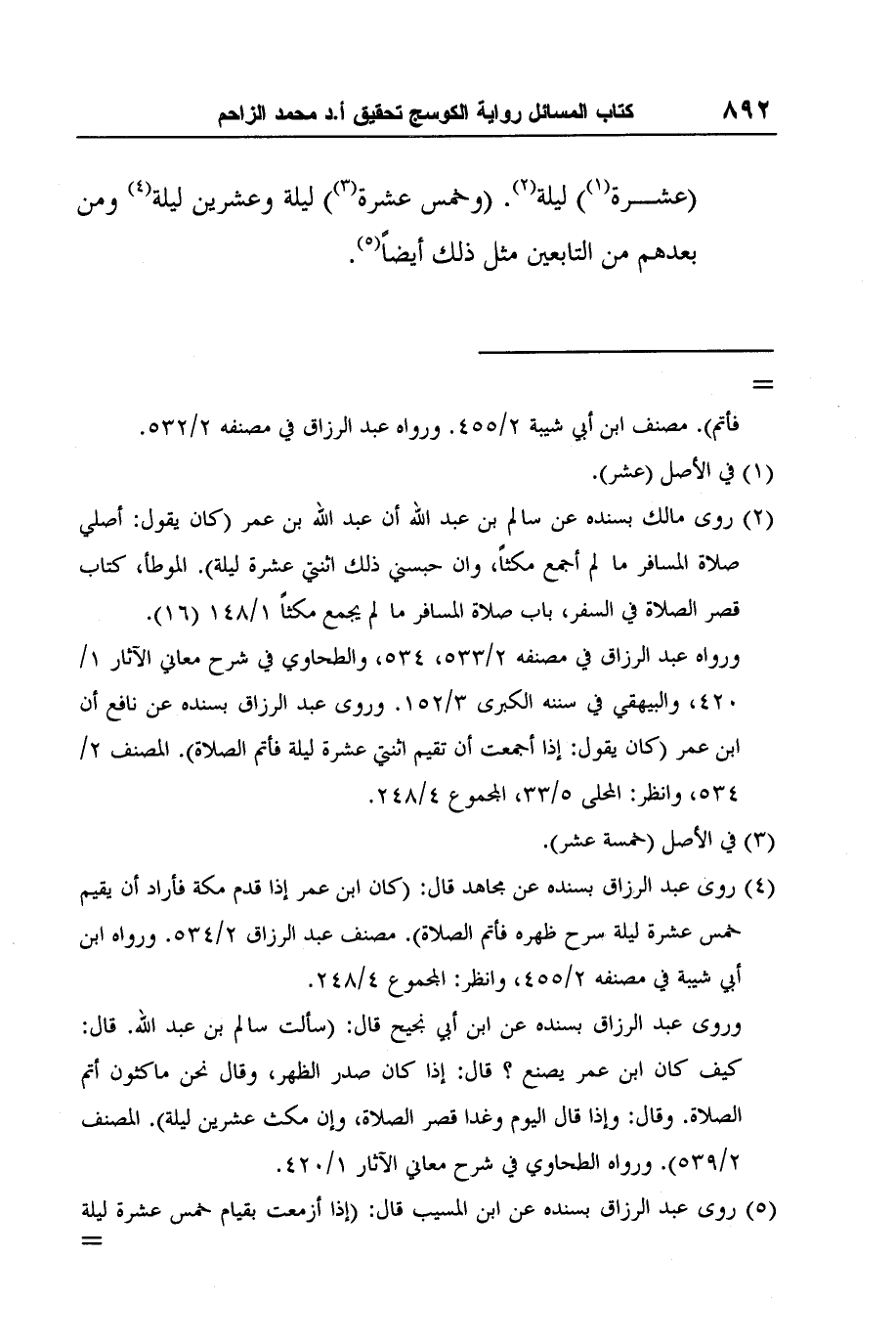 5 روى عبد الرزاق بسنده عن ابن المسيب قال: (إذا أزمعت بقيام خمس عشرة ليلة فأتم) . مصنف عبد الرزاق 2/535. ورواه ابن أبي شيبة في مصنفه 2/454. وروى ابن أبي شيبة بسنده عن سعيد بن جبير قال: (إذا أقمت أكثر من خمس عشرة فأتم الصلاة) . المصنف 2/455.