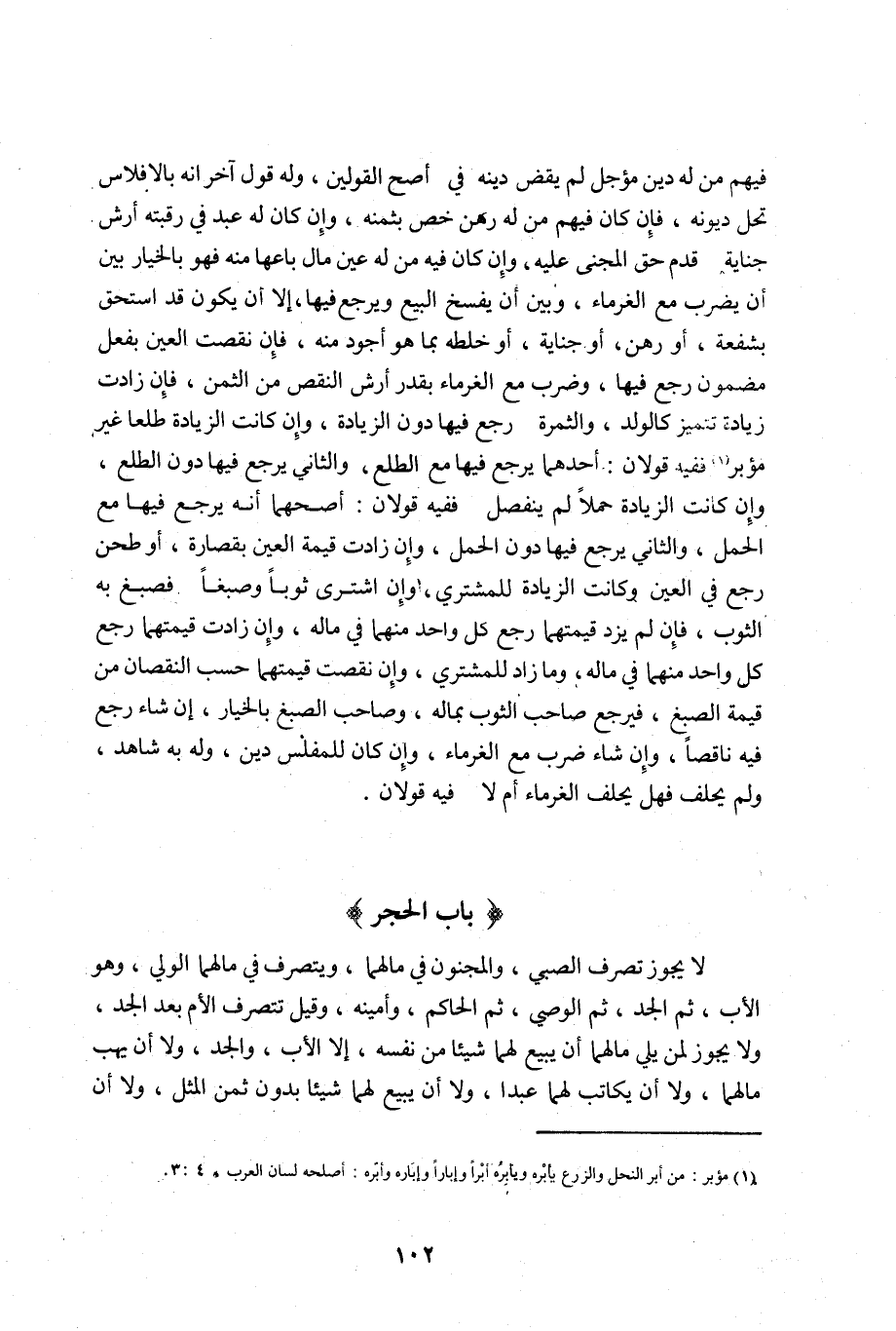 فيهم من له دين مؤجل لم يقض دينه في أصح القولين وله قول آخر انه بالإفلاس تحل ديونه فإن كان فيهم من له رهن خص بثمنه وان كان له عبد في رقبته إرش جناية قدم حق المجني عليه وان كان فيه من له عين مال باعها منه فهو بالخيار بين أن يضرب مع الغرماء وبين أن يفسخ البيع ويرجع فيها الا أن يكون قد استحق بشفعة أو رهن أو جناية أو خلطة بما هو أجود منه فإن نقصت العين بفعل مضمون رجع فيها وضرب مع الغرماء بقدر إرش النقص من الثمن فإن زادت زيادة تتميز كالولد والثمرة رجع فيها دون الزيادة وان كانت الزيادة طلعا غير مؤبر1 ففيه قولان: أحدهما يرجع فيها مع الطلع والثاني يرجع فيها دون الطلع وان كانت الزيادة حملا لم ينفصل ففيه قولان أصحهما أنه يرجع فيها مع الحمل والثاني يرجع فيها دون الحمل وان زادت قيمة العين بقصارة أو طحن رجع في العين وكانت الزيادة للمشتري وان اشترى ثوبا وصبغا فصبغ به الثوب فإن لم يزد قيمتها رجع كل واحد منهما في ماله وان زادت قيمتها رجع كل واحد منهما في ماله وما زاد للمشتري وان نقصت قيمتهما حسب النقصان من قيمة الصبغ فيرجع صاحب الثوب بماله وصاحب الصبغ بالخيار ان شاء رجع فيه ناقصا وان شاء ضرب مع الغرماء وان كان للمفلس دين وله به شاهد ولم يحلف فهل يحلف الغرماء أم لا فيه قولان.