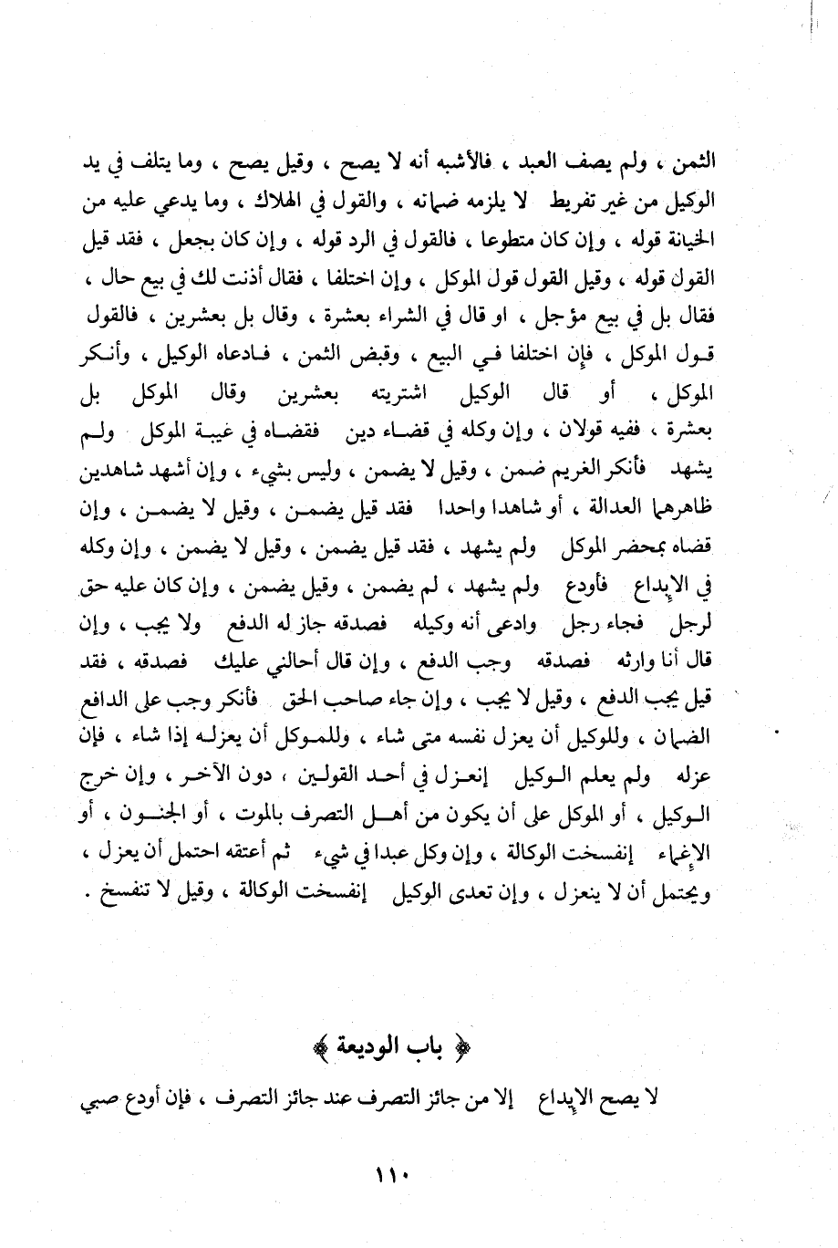 الثمن ولم يصف العبد فالأشبه أنه لا يصح وقيل يصح وما يتلف في يد الوكيل من غير تفريط لا يلزمه ضمانه والقول في الهلاك, وما يدعي عليه من الخيانة قوله وان كان متطوعا فالقول في الرد قوله وان كان بجعل فقد قيل القول قوله وقيل القول قول الموكل وان اختلفا فقال أذنت لح في بيع حال فقال بل في بيع مؤجل أو قال في الشراء بعشرة, وقال بل بعشرين فالقول قول الموكل فإن اختلفا في البيع وقبض الثمن فادعاه الوكيل وأنكر الموكل أو قال الوكيل اشتريته بعشرين وقال الموكل بل بعشرة ففيه قولان وان وكله في قضاء دين فقضاه في غيبة الموكل ولم يشهد فأنكر الغريم ضمن وقيل لا يضمن وليس بشيء وان أشهد شاهدين ظاهرهما العدالة أو شاهدا واحدا فقد قيل يضمن, وقيل لا يضمن وان قضاه بمحضر الموكل ولم يشهد فقد قيل يضمن, وقيل لا يضمن وان وكله في الايداع فأودع ولم يشهد لم يضمن وقيل يضمن وان كان عليه حق لرجل فجاءرجل وادعى أنه وكيله فصدقه جاز له الدفع ولا يجب وان قال أنا وارثه فصدقه وجب الدفع وان قال أحالني عليك فصدقه فقد قيل يجب الدفع وقيل لا يجب, وان جاء صاحب الحق فأنكر وجب على الدافع الضمان وللوكيل أن يعزل نفسه متى شاء وللموكل أن يعزله اذا شاء فإن عزله ولم يعلم الوكيل انعزل في أحد القولين دون الآخر وان خرج الوكيل أو الموكل على أن يكون من أهل التصرف بالموت أو الجنون أو الاغماء انفسخت الوكالة وان وكل عبدا في شيء ثم أعتقه احتمل أن يعزل ويحتمل أن لا ينعزل وان تعدى الوكيل انفسخت الوكالة وقيل لا تنفسخ.