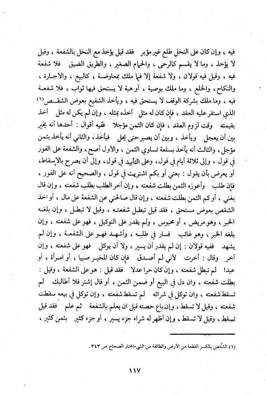 فيه وان كان على النخل طلع غير مؤبر, فقد قيل يؤخذ مع النخل بالشفعة, وقيل لا يؤخذ, وما لا يقسم كالرحى, والحمام الصغير, والطريق الضيق, فلا شفعة فيه وقيل فيه قولان ولا شفعة الا فيما ملك بمعاوضة كالبيع, والاجارة, والنكاح, والخلع وما ملك بوصية أو هبه لا يستحق فيها ثواب فلا شفعة فيه وما ملك بشركة الوقف لا يستحق فيه ويأخذ الشفيع بعوض الشقص1 الذي استقر عليه العقد فإن كان له مثل أخذه بمثله وان لم يكن له مثل أخذ بقيمته وقت لزوم العقد فإن كان الثمن مؤجلا ففيه أقوال: أحدها أنه يخير بين أن يعجل ويأخذ وبين أن يصبر حتى يحل فيأخذ والثاني أنه يأخذ بثمن مؤجل والثالث أنه يأخذ بسلعة تساوي الثمن والأول أصح والشفعة على الفور في قول والى ثلاثة أيام في قول وعلى التأبيد في قول والى أن يصرح بالاسقاط أو يعرض بأن يقول: بعني أو بكم اشتريت في قول والصحيح أنه على الفور فإن طلب وأعوزه الثمن بطلت شفعته وان أخر الطلب بطلب شفعته وان قال بعني أو كم الثمن بطلت شفعته وان قال صالحني عن الشفعة على مال أو أخذ الشقص بعوض مستحق فقد قيل تبطل شفعته وقيل لا تبطل وان بلغه الخبر وهو مريض أو محبوس ولم يقدر على التوكيل فهو على شفعته وان بلغه الخبر وهو غائب فسار في طلبه وأشهد فهو على الشفعه وان لم يشهد ففيه قولان: ان لم يقدر أن يسير ولا أن يوكل فهو على شفعته وان أخر وقال: أخرت لأني لم أصدق فإن كان الخبر صبيا أو امرأة أو عبدا لم تبطل شفعته وان كان حرا عدلا فقد قيل: هو على الشفعه وقيل: بطلت شفعته وان دل في البيع أو ضمن الثمن أو قال اشتر فلا أطالبك لم تسقط شفعته وان توكل في شرائه لم تسقط شفعته وان توكل في بيعه سقطت شفعته وقيل لا تسقط وان باع حصته قبل أن يعلم بالشفعة ثم علم فقد قيل تسقط وقيل لا تسقط وان أظهر له شراء جزء يسير أو جزء كثير بثمن كثير