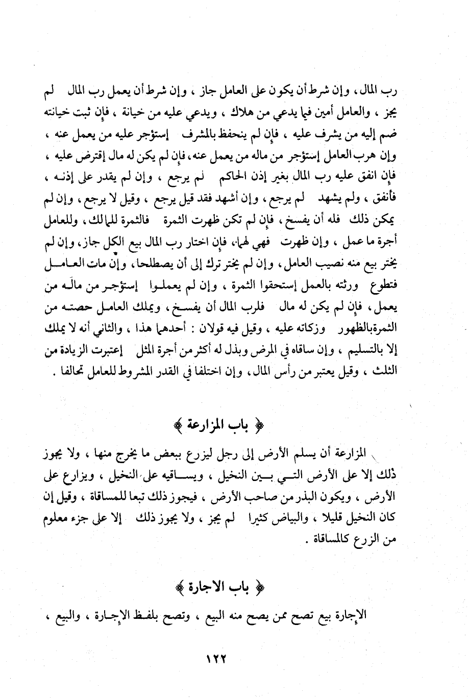 المزارعة أن يسلم الأرض الى رجل ليزرع ببعض ما يخرج منها ولا يجوز ذلك الا على الأرض التي بين النخيل ويساقيه على النخيل ويزارع على الأرض ويكون البذر من صاحب الأرض فيجوز ذلك تبعا للمساقاة وقيل ان كان النخيل قليلا والبياض كثيرا لم يجز ولايجوز ذلك الا على جزء معلوم من الزرع كالمساقاة.