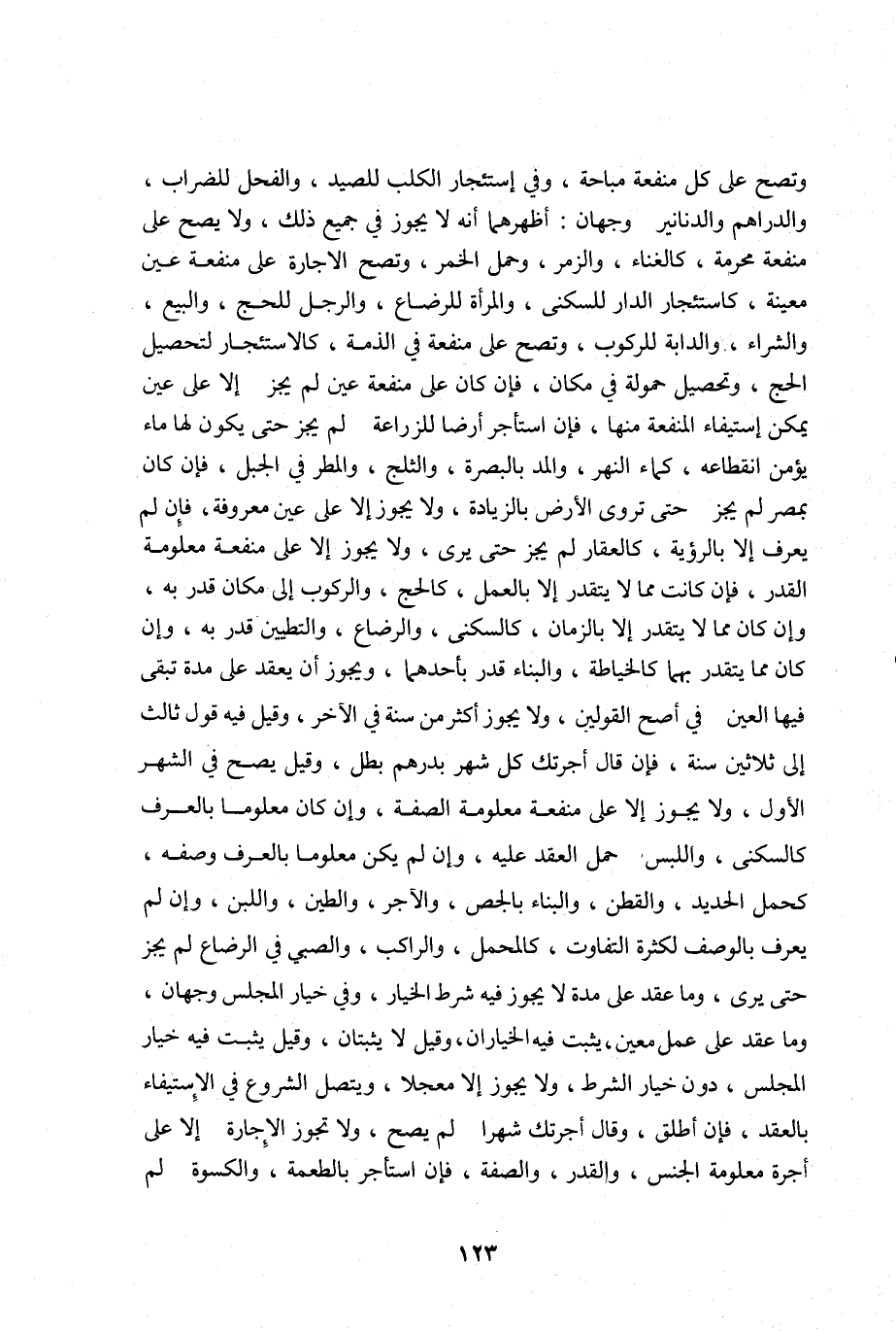 وتصح على كل منفعة مباحة في استئجار الكلب للصيد والفحل للضراب والدراهم والدنانير وجهان: أظهرهما أنه لا يجوز في جميع ذلك ولا يصح على منفعة محرمة كالغناء والزمر وحمل الخمر وتصح الاجارة على منفعة عين معينة كاستئجار الدار للسكنى والمرأة للرضاع والرجل للحج والبيع والشراء والدابة للركوب وتصح على منفعة في الذمة كاالإستئجار لتحصيل الحج وتحصيل حمولة في مكان فإن كان على منفعة عين لم يجز الا على عين يمكن اسيفاء المنفعة منها فإن استأجر أرضا للزراعة لم يجز حتى يكون لها ماء يؤمن انقطاعه كماء النهر والمد بالبصرة والثلج والمطر في الجبل فإن كان بمصر لم يجز حتى تروى الأرض بالزيادة ولا يجوز الا على عين مرفوعه فإن لم يعرف الا بالرؤية كالعقار لم يجز حتى يرى ولا يجوز الا على منفعة معلومة القدر فإن كانت مما لا يتقدر الا بالعمل كالحج والركوب الى مكان قدر به وان كان مما لا يتقدر لا بالزمان كالسكنى والرضاع والتطيين قدر به وان كان مما يتقدر بهما كالخياطة والبناء قدر بأحدهما ويجوز أن يعقد على مدة تبقى فيها العين في أصح القولين ولا يجوز أكثر من سنة في الآخر وقيل فيه قول ثالث الى ثلاثين سنة فإن قال أجرتك كل شهر بدرهم بطل وقيل يصح في الشهر الأول ولا يجوز الا على منفعة معلومة الصفة وان كان معلوما بالعرف كالسكنى واللبس حمل العقد عليه وان لم يكن معلوما بالعرف وصفه كحمل الحديد والقطن والبناء بالجص والآجر والطين واللبن وان لم يعرف بالوصف لكثرة التفاوت كالمحمل والراكب والصبي في الرضاع لم يجز حتى يرى وما عقد على مدة لا يجوز فيه شرط الخيار وفي خيار المجلس وجهان وما عقد على عمل معين يثبت فيه الخياران وقيل لا يثبتان وقيل يثبت فيه خيار المجلس دون خيار الشرط ولا يجوز الا معجلا ويتصل الشروع في الاستيفاء بالعقد فإن أطلق وقال أجرتك شهرا لم يصح ولا تجوز الاجارة الا على أجرة معلومة الجنس والقدر والصفة فإن استأجر بالطعمة والكسوة لم