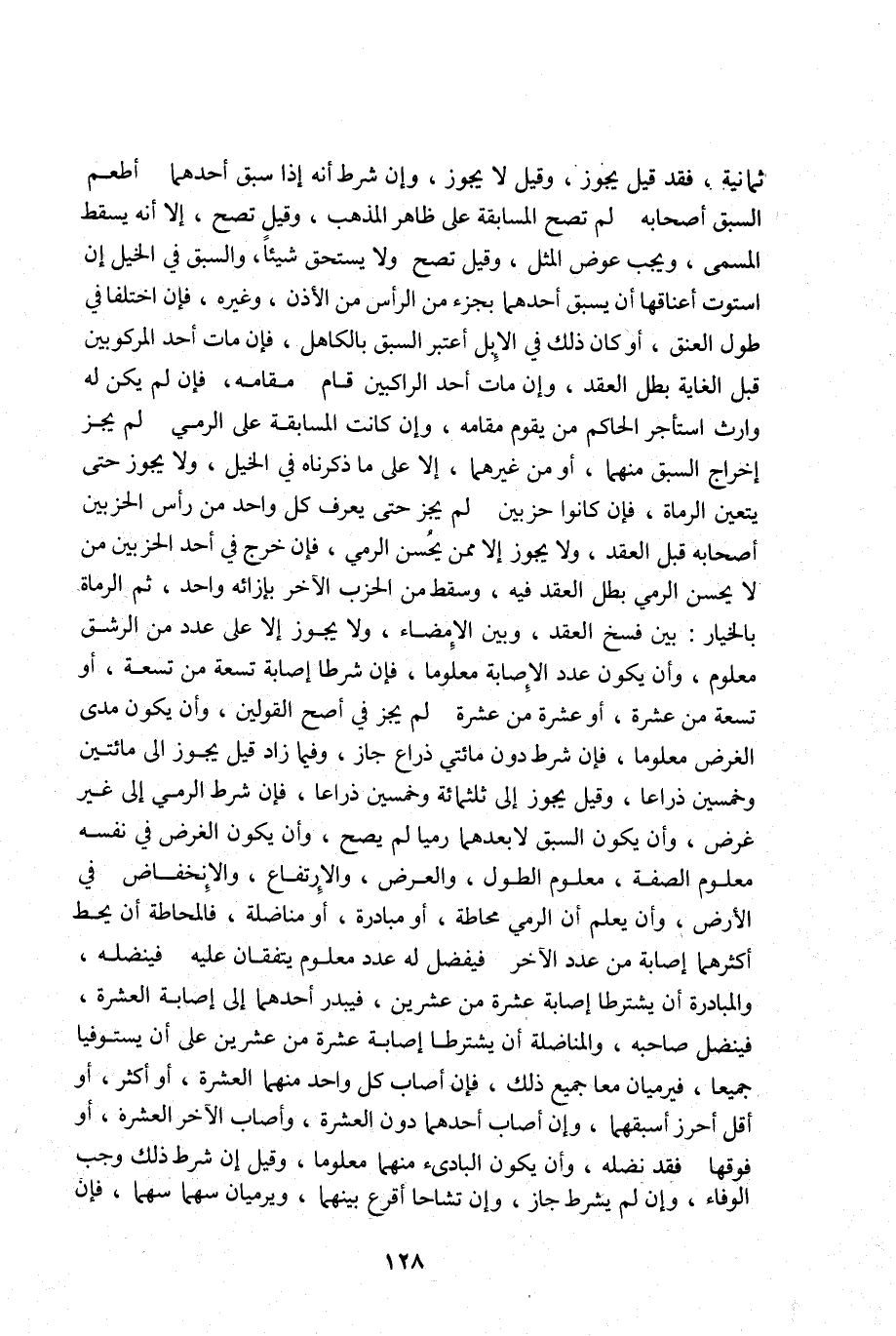 ثمانية فقد قيل يجوز, وقيل لا يجوز وان شرط أنه اذا سبق أحدهما أطعم السبق أصحابه لم تصح المسابقة على ظاهر المذهب وقيل تصح الا أنه يسقط المسمى, ويجب عوض المثل وقيل تصح ولا يستحق شيئا والسبق في الخيل ان استوت أعناقها أن يسبق أحدهما بجزء من الرأس من الأذن وغيره, فإن اختلفا في طول العنق أو كان ذلك في الابل أعتبر السبق بالكاهل فان مات أحد المركوبين قبل الغاية بطل العقد, وان مات أحد الراكبين قام مقامه فان لم يكن له وارث استأجر الحاكم من يقوم مقامه, وان كانت المسابقة على الرمي لم يجز اخراج السبق منهما أو من غيرهما الا على ما ذكرناه في الخيل, ولا يجوز حتى يتعين الرماه فإن كانوا حزبين لم يجز حتى يعرف كل واحد من رأس الحزبين أصحابه قبل العقد, ولا يجوز الا ممن يحسن الرمي فإن خرج في أحد الحزبين من لا يحسن الرمي بطل العقد فيه وسقط من الحزب الآخر بإزائه واحد ثم الرماة بالخيار: بين فسخ العقد وبين الامضاء ولا يجوز الا على الرشق معلوم وأن يكون عدد الإصابة معلوما فإن شرطا اصابة تسعة من تسعة أتسعة من عشرة أو عشرة من عشرة لم يجز في أصح القولين وأن يكون مدى الغرض معلوما فإن شرط دون مائتي ذراع جاز وفيما زاد قيل يجوز الا مائتين وخمسين ذراعا وقيل يجوز الى ثلثمائة وخمسين ذراعا فإن شرط الرمي الى غير غرض وأن يكون السبق لابعادهما رميا لم يصح وأن يكون الغرض في نفسه معلوم الصفة معلوم الطول والعرض والارتفاع والانخفاض في الأرض وأن يعلم أن الرمي محاطة أو مبادرة أو مناضلة فالمحاطة أن يحط أكثرهما اصابة من عدد الآخر فيفضل له عدد معلوم فيتفقان عليه فينضله والمبادرة أن يشترطا اصابة عشرة من عشرين فيبدر أحدهما الى اصابة العشرة فينضل صاحبه والمناضلة أن يشترطا اصابة عشرة من عشرين على أن يستوفيا جميعا فيرميان معا جميع ذلك فان أصاب كل واحد منهما العشرة أو أكثر أو أقل أحرز أسبقهما وان أصاب أحدهما دون العشرة وأصاب الآخر العشرة أو فوقها فقد نضله وأن يكون الباديء منهما معلوما وقيل ان شرط ذلك وجب الوفاء وان لم يشرط جاز وان تشاحا أقرع بينهما ويرميان سهما سهما فإن