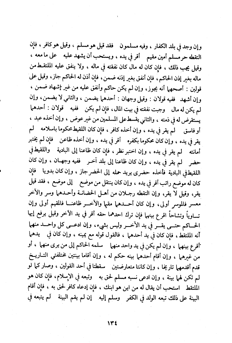 وإن وجد في بلد الكفار وفيه مسلمون فقد قيل هو مسلم وقيل هو كافر فإن التقطه حر مسلم أمين مقيم أقر في يده ويستحب أن يشهد عليه على ما معه وقيل يجب ذلك فإن كان له مال كان نفقته في ماله ولا ينفق عليه الملتقط من ماله بغير إذن الحاكم فإن أنفق بغير إذنه ضمن فإن أذن له الحاكم جاز وقيل على قولين: أصحهما أنه يجوز وإن لم يكن حاكم وأنفق عليه من غير إشهاد ضمن وإن أشهد ففيه قولان: وقيل وجهان: أحدهما يضمن والثاني لا يضمن وإن لم يكن له مال وجبت نفقته في بيت المال فإن لم يكن ففيه قولان: أحدهما يستقرض له في ذمته, والثاني يقسط على المسلمين من غير عوض وإن أخذه عبد أو فاسق لم يقر في يده وإن أخذه كافر فإن كان اللقيط محكوما باسلامه لم يقر في يده, وإن كان محكوما بكفره أقر في يده وإن أخذه ظاعن فإن لم يختبر أمانته لم يقر في يده وإن اختبر نظر فإن كان ظاعنا إلى البادية واللقيط في حضر لم يقر في يده وإن كان ظاعنا إلى بلد آخر ففيه وجهان وإن كان اللقيط في البادية فأخذه حضرى يريد حمله إلى الحضر جاز وإن كان بدويا فإن كان له موضع راتب أقر في يده وإن كان ينتقل من موضع إلى موضع فقد قيل يقر وقيل لا يقر وإن التقطه رجلان من أهل الحضانة وأحدهما وسر والآخر معسر فالموسر أولى وإن كان أحدهما مقيما والآخر ظاعنا فالمقيم أولى وإن تساويأ وتشاحأ اقرع بينهما فإن ترك احدهما حقه أقر في يد الآخر وقيل يرفع إيها الحاكم حتى يقر في يد الأخر وليس بشيء وإن ادعى كل واحد منهما أنه الملتقط فإن كان في يد أحدهما فالقول قوله مع يمينه وإن كان في يدهما أقرع بينهما وإن لم يكن في يد واحد منهما سلمه الحاكم إلى من يرى منهما أو من غيرهما وإن أقام أحدهما بينه حكم له وإن أقاما بينتين مختلفتي التاريخ قدم أقدمهما تاريخا وإن كانتا متعارضتين سقطتا في أحد القولين وصار كما لو لم تكن لهما بينة وإن ادعى نسبه مسلم لحق به وتبعه في الإسلام فإن كان هو الملتقط استحب أن يقال له من اين هو ابنك فإن إدعاه كافر لحق به فإن أقام البينة على ذلك تبعه الولد في الكفر وسلم إليه إن لم يقم البينة لم يتبعه في
