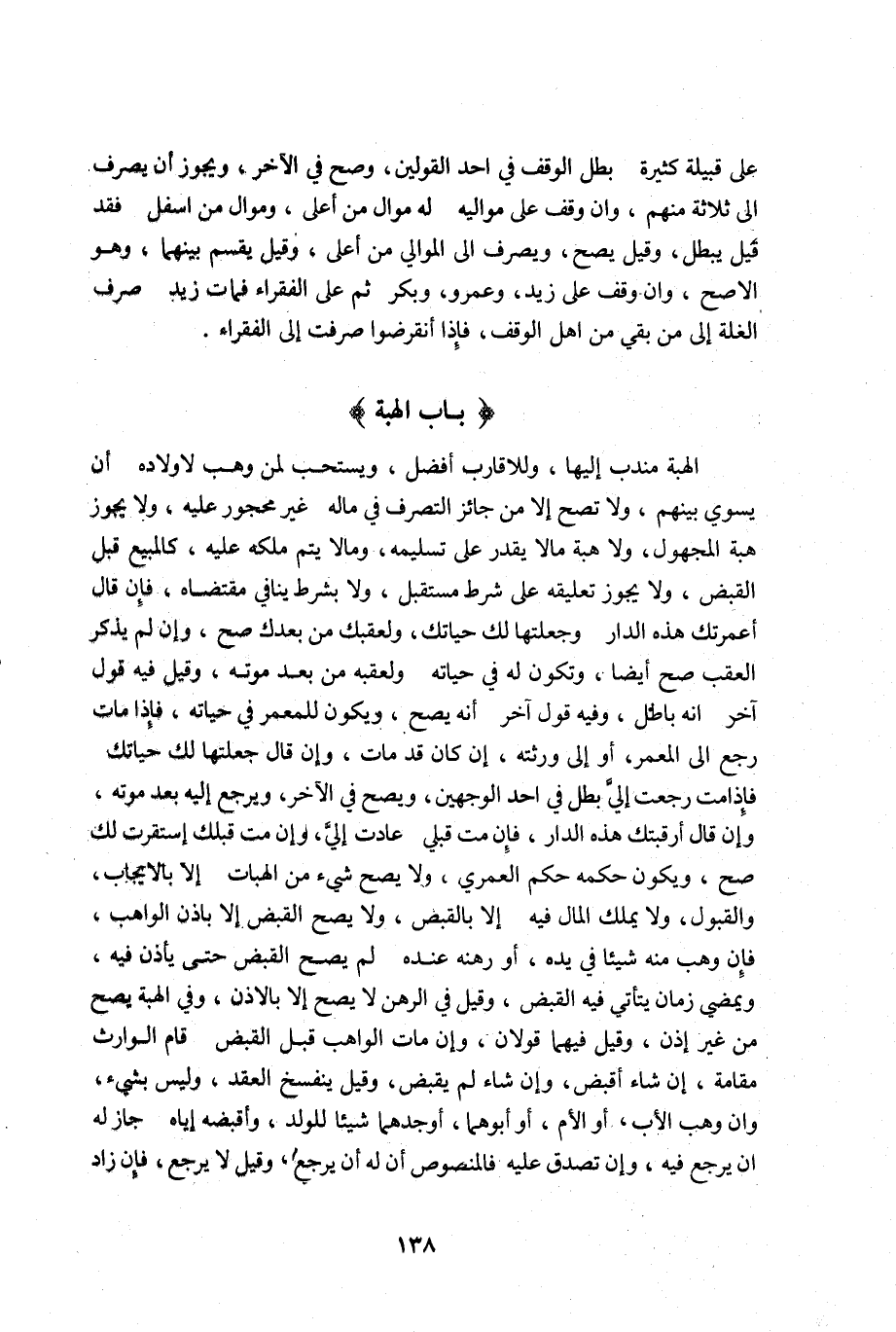 الهبة مندب إليها وللاقارب أفضل, ويستحب لمن وهب لأولاده أن يسوي بينهم, ولا تصح إلا من جائز التصرف في ماله غير محجورعليه ولا يجوز هبة المجهول, ولا هبة مالا يقدر على تسليمه ومالا يتم ملكه عليه كالمبيع قبل القبض ولا يجوز تعليقه على شرط مستقبل, ولا بشرط ينافي مقتضاه فإن قال أعمرتك هذه الدار وجعلتها لك حياتك ولعقبك من بعدك صح, وإن لم يذكر العقب صح أيضا وتكون له في حياته ولعقبه من بعد موته وقيل فيه قول آخر انه باطل وفيه قول آخر أنه يصح ويكون للمعمر في حياته فاذا مات رجع الى المعمر أو إلى ورثته إن كان قد مات, وإن قال جعلتها لك حياتك فإذا مت رجعت إلي بطل في احد الوجهين ويصح في الآخر ويرجع اليه بعد موته, وإن قال أرقبتك هذه الدار فإن مت قبلي عادت إلي وإن مت قبلك إستقرت لك صح ويكون حكمه حكم العمري, ولايصح شيء من الهبات إلأ بالإيجاب والقبول ولا يملك المال فيه إلا بالقبض ولا يصح القبض إلا بإذن الواهب فإن وهب منه شيئا في يده أو رهنه عنده لم يصح القبض حتى يأذن فيه, ويمضي زمان يتأتى فيه القبض وقيل في الرهن لا يصح إلا بالاذن وفي الهبة يصح من غير إذن وقيل فيهما قولان وإن مات الواهب قبل القبض قام الوارث مقامة إن شاء أقبض وإن شاء لم يقبض وقيل ينفسخ العقد وليس بشيء وان وهب الأب أو الأم أو أبوهما أوجدهما شيئا للولد وأقبضه إياه جاز له ان يرجع فيه وإن تصدق عليه فالمنصوص أن له أن يرجع وقيل لا يرجع فإن زاد