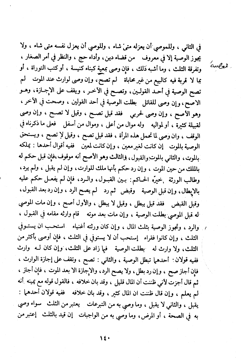 في الثاني وللموصي أن يعزله متى شاء وللوصي أن يعزل نفسه متى شاء ولا يجوز الوصية الا في معروف من قضاء دين وأداء حج والنظر في أمر الصغار وتفرقة الثلث وما أشبه ذلك فإن وصى بمعية كبناء كنيسة أو كتب التوراة أو بما لا قربة فيه كالبيع من غير محاباة لم تصح, وإن وصى لوارث عند الموت لم تصح الوصية في أحد القولين, وتصح في الأخر ويقف على الإجازة وهو الاصح وإن وصى للقاتل بطلت الوصية في أحد القولين وصحت في الأخر, وهو الأصح وإن وصى لحربي فقد قيل تصح وقيل لا تصح وإن وصى لقبيلة كثيرة أو لمواليه وله موال من أعلى وموال من أسفل فعلى ما ذكرناه في الوقف, وان وصى لما تحمل هذه المرأة فقد قيل تصح وقيل لا تصح ويستحق الوصية بالموت ان كانت لغير معين وإن كانت لمعين ففيه أقوال: أحدها يملكه بالموت والثاني بالموت والقبرل والثالث, وهو الأصح أنه موقوف فإن قبل حكم له بالملك من حين الموت وإن رد حكم بانها ملك الوارث وإن لم يقبل ولم يرد وطالب الورثة خيره الحاكم: بين القبول والرد فإن لم يفعل حكم عليه بالإبطال وإن قبل الوصية وقبض ثم رد لم يصح الرد وإن رد بعد القبول وقبل القبض فقد قيل يبطل وقيل لا يبطل والأول أصح وإن مات الموصي له قبل الموصي بطلت الوصية وإن مات بعد موته قام وارثه مقامه في القبول والرد وتجوز الوصية بثلث المال وإن كان ورثته أغنياء استحب ان يستوفي الثلث وإن كانوا فقراء إستحب أن لا يستوفي في الثلث فإن أوصى بأكثر من الثلث ولا وارث له بطلت الوصية فيما زاد على الثلث وإن كان له وارث ففيه قولان: أحدهما تبطل الوصية والثانى تصح وتقف على إجازة الوارث فإن أجاز صح وإن رد بطل ولا يصح الرد والإجازة الا بعد الموت فإن أجاز ثم قال أجزت لأني ظننت أن المال قليل وقد بان خلافه فالقول قوله مع يمينه أنه لم يعلم وان قال ظننت ان المال قليلوقد بان خلافه فالقول قوله مع يمينه انه لم يعلم وإن قال ظننت أن المال كثير وقد بان خلافه ففيه قولان أحدهما: يقبل والثانى لايقبل وماوصى به من التبرعات يعتبر من الثلث سواء وصي به في الصحة أو المرض وما وصي به من الواجبات إن قيد بالثلث اعتبر من