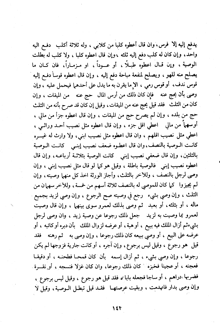 يدفع إليه الا فرس وان قال أعطوه كلبا من كلابي وله ثلاثة أكلب دفع اليه واحد, وإن كان له كلب دفع إليه ثلثه وان قال اعطوه كلبا ولا كلب له بطلت الوصية, وان قال اعطوه طبلا أو عودا او مزمارا فإن كان ما يصلح منه للهو ويصلح لمنفعة مباحة دفع إليه, وإن قال اعطوه قوسا دفع إليه قوس ندف أو قوس رمي الاما يقرن به ما يدل على أحدهما فيحمل عليه, وان وصى بأن يحج عنه فإن كان ذلك من رأس المال حج عنه من الميقإت وان كان من الثلث فقد قيل يحج عنه من الميقات, وقيل إن كان قد صرح بأنه من الثلث حج من بلده وإن لم يصرح حج من الميقات وإن قال اعطوه جزأ من مالي أوسهما من مالي اعطي اقل جزء وإن قال اعطوه مثل نصيب أحد وراثي اعطي مثل نصيب اقلهم, وان قال اعطوه مثل نصيب ابني ولا وارث له غيره كانت الوصية بالنصف وان قال اعطوه ضعف نصيب ابني كانت الوصية بالثلثين, وإن قال ضعفي نصيب ابني كانت الوصية بثلاثة أرباعه, وإن قال اعطوه نصيب ابني فالوصية باطلة وقيل هو كما لو قال مثل نصيب ابني وإن وصى لرجل بالنصف وللآخر بالثلث, وأجاز الورثة اخذ كل منهما وصيته وإن لم يجيزوا كما كان للموصى له بالنصف ثلاثة أسهم من خمسة وللآخر سهمان من الثلث, وإن وصي بشيء رجع في وصيته صح الرجوع وإن وصي لزيد بجميع ماله أو بثلثه, أو بعبد ثم وصى بذلك لعمرو سوى بينهما وإن قال وصيت لعمرو بما وصيت به لزيد جعل ذلك رجوعا عن وصية زيد وان وصى لرجل بشيء ثم أزال الملك فيه ببيع أوهبه أو عرضه لزوال الملك بأن دبره, أو كاتبه أو عرضه على البيع أو وصي ببيعه كان ذلك رجوعا وإن وصى به ثم رهنه فقد قيل هو رجوع, وقيل ليس برجوع وإن آجره أو كانت جارية فزوجها لم يكن رجوعا, وإن وصى بشيء ثم أزال اسمه بان كان قمحا فطحنه أو دقيقا فعجنه أو عجينا فخبزه كان ذلك رجوعا, وان كان غزلا فنسجه أو نقرة فضربها دراهم أو ساجا فجعله بابا فقد قيل هو رجوع وقيل ليس برجوع وإن وصى بدار فانهدمت وبقيت عرصتها فقد قيل تبطل الوصية وقيل لا