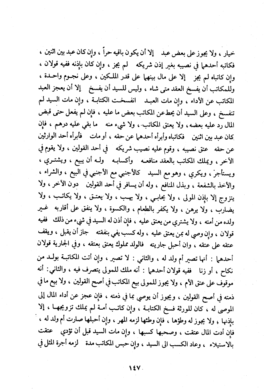 خيار ولا يجوز على بعض عبد الا أن يكون باقيه حرأ, وإن كان عبد بين اثنين فكاتبه أحدهما في نصيبه بغير إذن شريكه لم يجز وإن كان بإذنه ففيه قولان, وإن كاتباه لم يجز إلا على مال بينهما على قدر الملكين وعلى نجوم واحدة وللمكاتب أن يفسخ العقد متى شاء, وليس للسيد أن يفسخ إلا أن يعجز العبد المكاتب عن الأداء وإن مات العبد انفسخت الكتابة, وإن مات السيد لم تنفسخ وعلى السيد أن يحط عن المكاتب بعض ما عليه فإن لم يفعل حتى قبض المال رد عليه بعضه, ولا يعتق المكاتب ولا شيء منه ما بقي عليه درهم فإن كان عبد بين اثنين فكاتباه وأبرأه أحدهما عن حقه, أو مات فابرأه أحد الوارثين عن حقه عتق نصيبه وقوم عليه نصيب شريكه في أحد القولين, ولا يقوم في الآخر, ويملك المكاتب بالعقد منافعه وأكسابه وله أن يبيع ويشتري ويستأجر ويكري وهو مع السيد كالأجنبي مع الأجنبى في البيع, والشراء والأخذ بالشفعة وبذل المنافع وله أن يسافر في أحد القولين دون الآخر, ولا يتزوج إلا بإذن المولى ولا يحابى ولا يهب ولا يعتق ولا يكاتب ولا يضارب ولا يرهن, ولا يكفر بالطعام والكسوة ولا ينفق على أقاربه غير ولده من أمته ولا يشتري من يعتق عليه فإن أذن له السيد في شيء من ذلك ففيه قولان, وإن وصي له بمن يعتق عليه وله كسب يفي بنفقته جاز أن يقبل ويقف عتقه على عتقه وان أحبل جاريته فالولد مملوك يعتق بعتقه وفي الجارية قولان أحدهما: أنها تصير أم ولد له الثاني: لا تصير, وإن أتت المكاتبة بولد من نكاح أو زنا ففيه قولان أحدهما: أنه ملك للمولى يتصرف فيه والثاني: أنه موقوف على عتق الأم ولا يجوز للمولى بيع المكاتب في أصح القولين ولا بيع ما في ذمته في أصح القولين, ويجوز أن يوصي بما في ذمته فإن عجز عن أداء المال الى الموصى له كان للورثة فسخ الكتابة وإن كاتب أمة لم يملك تزويجها الا بإذنها ولا يجوز له وطؤها فإن وطئها لزمه المهر, وإن أحبلها صارت أم ولد له فإن أدت المال عتقت وصحبها كسبها وإن مات السيد قبل أن تؤدي عتقت بالإستيلاء, وعاد الكسب الى السيد وإن حبس المكاتب مدة لزمه أجرة المثل في