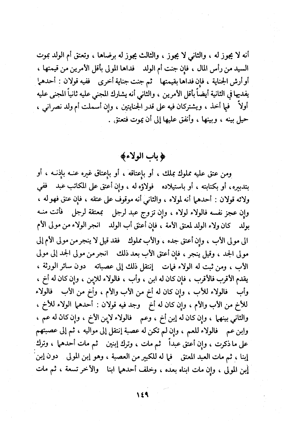 ومن عتق عليه مملوك بملك أو بإعتاقه أو بإعتاق غيره عنه بإذنه, أو بتدبيره أو بكتابته, أو بإستيلاده فولاؤه له, وإن أعتق على المكاتب عبد ففى ولائه قولان: أحدهما أنه لمولاه, والثاني أنه موقوف على عتقه فإن عتق فهو له وإن عجز نفسه فالولاء لولاه, وإن تزوج عبد لرجل بمعتقة لرجل فأتت منه بولد كان ولاء الولد لمعتق الأمة فإن أعتق أب الولد انجر الولاء من مولى الأم الى مولى الأب, وإن أعتق جده والأب مملوك فقد قيل لا ينجر من مولى الأم إلى مولى الجد, وقيل ينجر فإن أعتق الأب بعد ذلك انجر من مولى الجد إلى مولى الأب ومن ثبت له الولاء فمات انتقل ذلك إلى عصباته دون سائر الورثة يقدم الأقرب فالأقرب فإن كان له ابن وأب فالولاء للإبن وإن كان له أخ وأب فالولاء للأب وإن كان له أخ من الأب والأم وأخ من الأب فالولاء للأخ من الأب والأم وإن كان له أخ وجد فيه قولان: أحدهما الولاء للأخ والثاني بينهما وإن كان له إبن أخ وعم فالولاء لإبن الأخ وإن كان له عم وا بن عم فالولاء للعم وإن لم تكن له عصبة إنتقل إلى مواليه ثم إلى عصبتهم على ما ذكرت وإن أعتق عبدا ثم مات وترك ابنين ثم مات أحدهما وترك ابنا ثم مات العبد المعتق فما له للكبير من العصبة وهو ابن المولى دون ابن ابن المولى وإن مات ابنا بعده وخلف أحدهما ابنا والآخر تسعة ثم مات