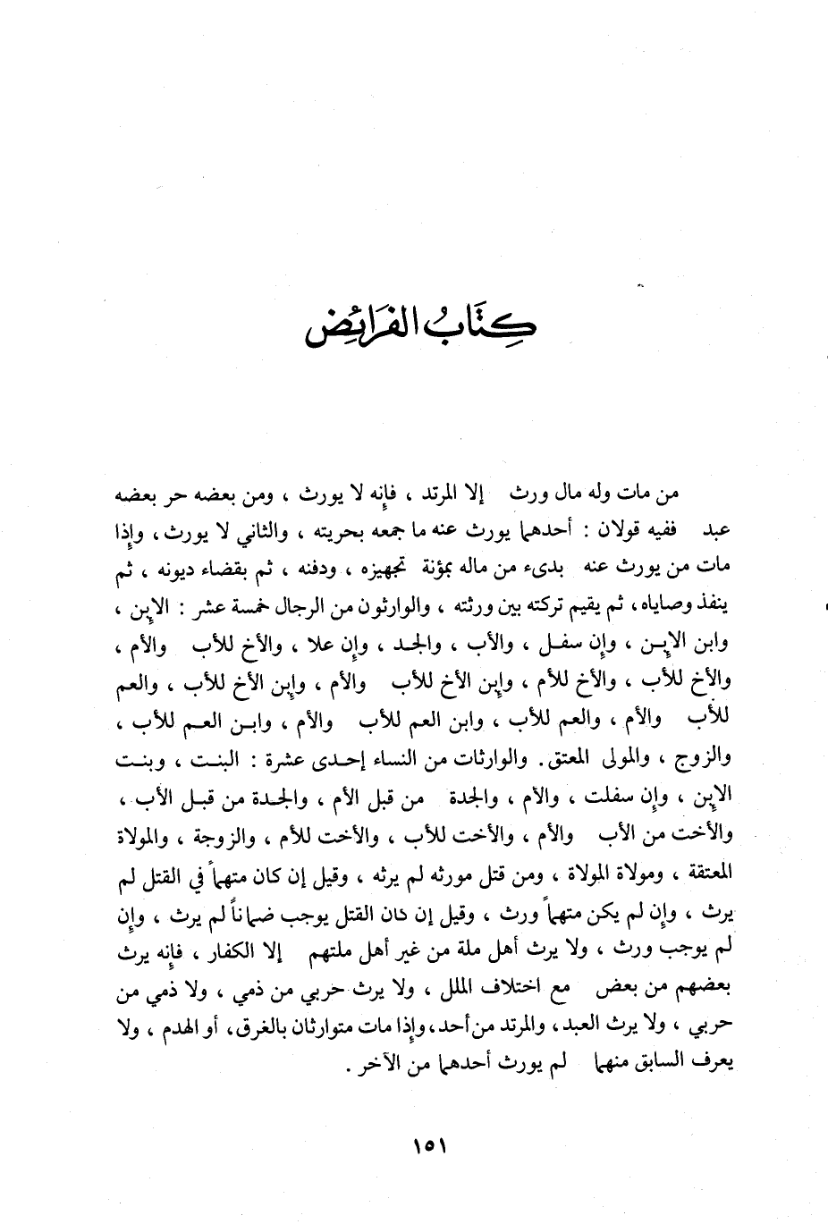 من مات وله مال ورث إلا المرتد فإنه لا يورث ومن بعضه حر بعضه عبد ففيه قولان: أحدهما يورث عنه ما جمعه بحريته والثاني لا يورث وإذا مات من يورث عنه بدىء من ماله بمؤنة تجهيزه ودفنه ثم بقضاء ديونه ثم ينفذ وصاياه ثم يقيم تركته بين ورثته والوارثون من الرجال خمسة عشر: الابن وابن الابن وإن سفل والأب والجد وإن علا والأخ للأب والأم والأخ للأب والأخ للأم وابن الأخ للأب والأم وابن الأخ للأب والعم للأب والأم والعم للأب وابن العم للأب والأم وابن العم للأب والزوج والمولى المعتق والوارثات من النساء إحدى عشرة البنت وبنت الابن وإن سفلت والأم والجدة من قبل الأم والجدة من قبل الأب والأخت من الأب والأم والأخت للأب والأخت للأم والزوجة والمولاة المعتقة ومولاة المولاة ومن قتل مورثه لم يرثه وقيل إن كان متهما في القتل لم يرث وإن لم يكن متهما ورث وقيل إن كان القتل يوجب ضمانا لم يرث وإن لم يوجب ورث ولا يرث أهل ملة من غير أهل ملتهم إلا الكفار فإنه يرث بعضهم من بعض مع اختلاف الملل ولا يرث حربى من ذمي ولا ذمي من حربي ولا يرث العبد والمرتد من أحد وإذا مات متوارثان بالغرق أو الهدم ولا يعرف السابق منهما لم يورث أحدهما من الآخر.
