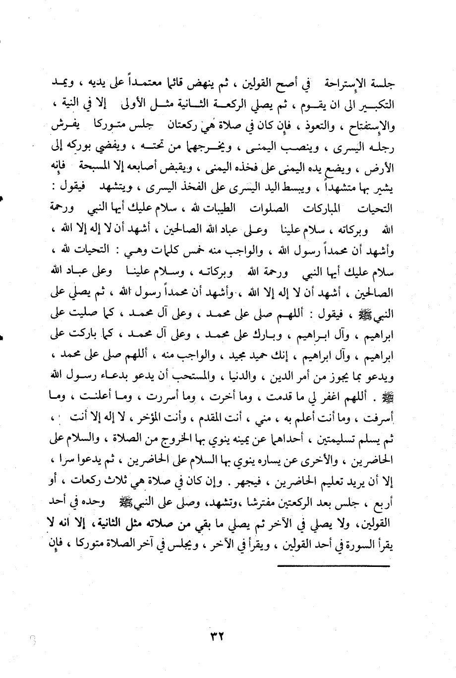 جلسة الإستراحة في أصح القولين ثم ينهض قائما معتمدا على يديه ويمد التكبير الى أن يقوم ثم يصلي الركعة الثانية مثل الأولى الا في النية والاستفتاح والتعوذ فإن كان في صلاة هي ركعتان جلس متوركا يفرش رجله اليسرى وينصب اليمنى ويخرجهما من تحته ويفضي بوركه الى الأرض ويضع يده اليمنى على فخذه اليمنى ويقبض أصابعه الا المسبحة فإنه يشير بها متشهدا ويبسط اليد اليسرى على الفخذ اليسرى ويتشهد فيقول: التحيات المباركات الصلوات الطيبات لله سلام عليك أيها النبي ورحمة الله وبركاته سلام علينا وعلى عباد الله الصالحين أشهد أن لا اله الا الله وأشهد أن محمدا رسول الله والواجب منه خمس كلمات: وهي التحيات لله سلام عليك أيها النبي ورحمة الله وبركاته وسلام علينا وعلى عباد الله الصالحين أشهد أن لا اله الا الله وأشهد أن محمدا رسول الله ثم يصلي على النبي صلى الله عليه وسلم فيقول: أللهم صلي على محمد وعلى آل محمد كما صليت على ابراهيم وآل ابراهيم وبارك على محمد وعلى آل محمد كما باركت على ابراهيم وآل ابراهيم انك حميد مجيد والواجب منه أللهم صلي على محمد ويدعو بما يجوز من أمر الدين والدنيا والمستحب أن يدعو بدعاء رسول الله صلى الله عليه وسلم أللهم اغفر لي ما قدمت وما أخرت وما أسررت وما أعلنت وما أسرفت وما أنت أعلم به مني أنت المقدم وأنت المؤخر لا اله الا أنت, ثم يسلم تسليمتين أحداهما عن يمينه ينوي بها الخروج من الصلاة والسلام على الحاضرين والأخرى عن يساره ينوي بها السلام على الحاضرين ثم يدعو سرا الا أن يريد تعليم الحاضرين فيجهر وان كان في صلاة هي ثلاث ركعات أو أربع جلس بعد الركعتين مفترشا وتشهد وصلي على النبي صلى الله عليه وسلم وحده في أحد القولين ولا يصلي في الآخر ثم يصلي ما بقي من صلاته مثل الثانية الا أنه لا يقرأ السورة في أحد القولين ويقرأ في الآخر ويجلس في آخر الصلاة متوركا فإن