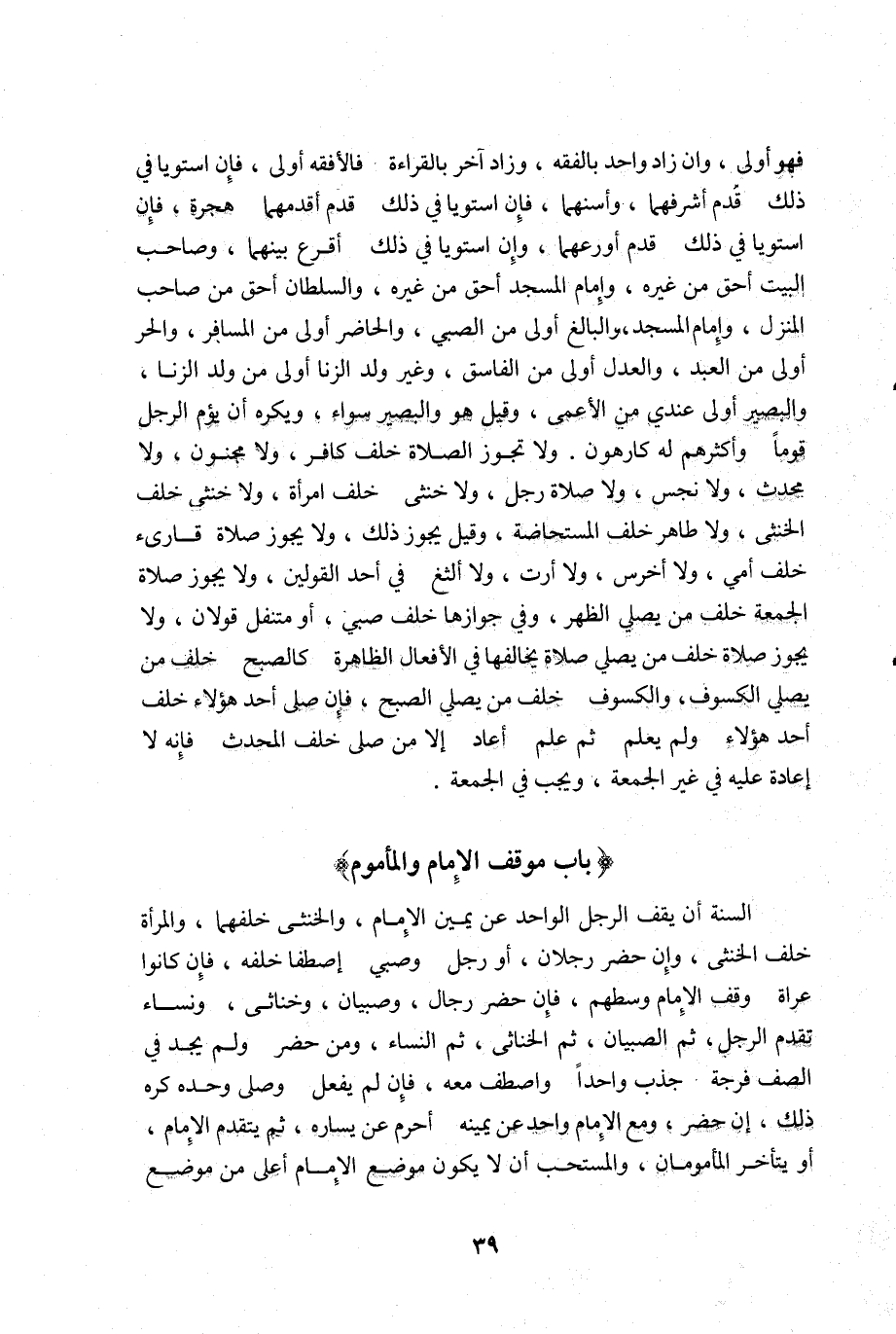 فهو أولى وان زاد واحد بالفقه وزاد آخر بالقراءة فالأفقه أولى فإن استويا في ذلك قدم أشرفهما وأسنهما فان استويا في ذلك قدم أقدمهما هجرة فان استويا في ذلك قدم أورعهما وان استويا في ذلك أقرع بينهما وصاحب البيت أحق من غيره وامام المسجد أحق من غيره والسلطان أحق من صاحب المنزل وامام المسجد والبالغ أولى من الصبي والحاضر أولى من المسافر والحر أولى من العبد والعدل أولى من الفاسق وغير ولد الزنا أولى من ولد الزنا والبصير أولى عندي من الأعمى وقيل هو والبصير سواء ويكره أن يؤم الرجل قوما وأكثرهم له كارهون ولا تجوز الصلاة خلف كافر ولا مجنون ولا محدث ولا نجس ولا صلاة رجل ولا خنثى خلف امرأة ولا خنثى خلف الخنثى ولا طاهر خلف المستحاضة وقيل يجوز ذلك ولا يجوز صلاة قارىء خلف أمي ولا أخرس ولا أرت ولا ألثغ في أحد القولين ولا يجوز صلاة الجمعة خلف من يصلي الظهر وفي جوازها خلف صبي أو متنفل قولان ولا يجوز صلاة خلف من يصلي صلاة يخالفها في الأفعال الظاهرة كالصبح خلف من يصلي الكسوف والكسوف خلف من يصلي الصبح فإن صلى أحد هؤلاء خلف أحد هؤلاء ولم يعلم ثم علم أعاد الا من صلى خلف المحدث فإنه لا اعادة عليه في غير الجمعة ويجب في الجمعة.
