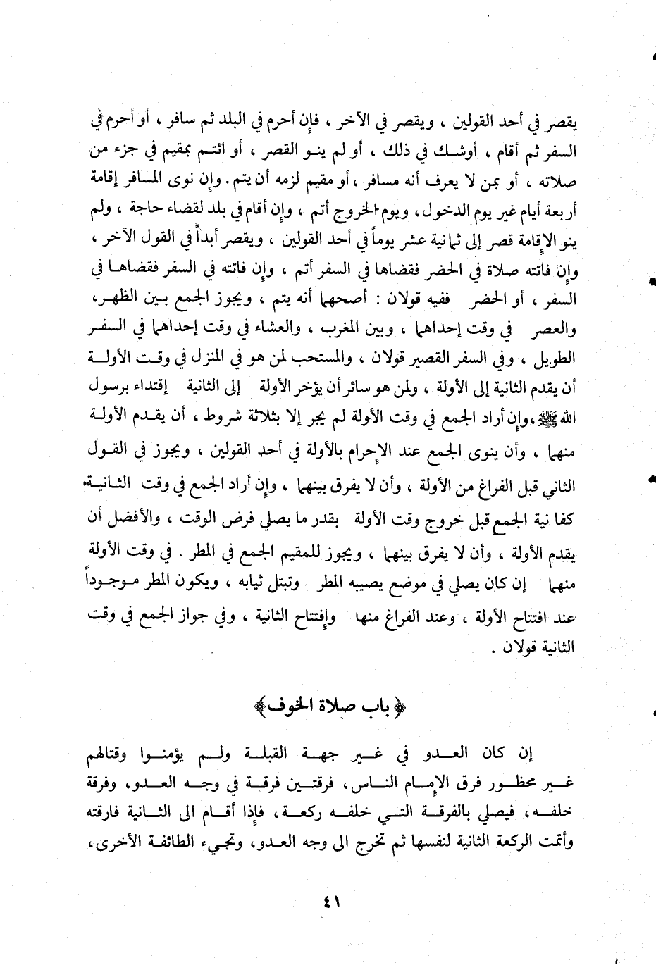 يقصر في أحد القولين ويقصر في الآخر فإن أحرم في البلد ثم سافر أو أحرم في السفر ثم أقام أو شك في ذلك أو لم ينو القصر أو ائتم بمقيم في جزء من صلاته أو بمن لا يعرف أنه مسافر أو مقيم لزمه أن يتم وان نوى المسافر اقامة أربعة أيام غير يوم الدخول ويوم الخروج أتم وان أقام في بلد لقضاء حاجة ولم ينو الاقامة قصر الى ثمانية عشر يوما في أحد القولين ويقصر أبدا في القول الآخر وان فاتته صلاة في الحضر فقضاها في السفر أتم وان فاتته في السفر فقضاها في السفر أو الحضر ففيه قولان أصحهما أنه يتم ويجوز الجمع بين الظهر والعصر في وقت احداهما وبين المغرب والعشاء في وقت احداهما في السفر الطويل وفي السفر القصير قولان والمستحب لمن هو في المنزل في وقت الأولة أن يقدم الثانية الى الأولة ولمن هو سائر أن يؤخر الأولة الى الثانية اقتداء برسول الله صلى الله عليه وسلم وان أراد الجمع في وقت الأولة لم يجز الا بثلاثة شروط أن يقدم الأولة منهما وأن ينوي الجمع عند الاحرام بالأولة في أحد القولين ويجوز في القول الثاني قبل الفراغ من الأولة وأن لا يفرق بينهما وان أراد الجمع في وقت الثانية كفا نية الجمع قبل خروج وقت الأولة بقدر ما يصلي فرض الوقت والأفضل أن يقدم الأولة وأن لا يفرق بينهما ويجوز للمقيم الجمع في المطر في وقت الأولة منهما ان كان يصلي في موضع يصيبه المطر وتبتل ثيابه ويكون المطر موجودا عند افتتاح الأولة وعند الفراغ منها وافتتاح الثانية وفي جواز الجمع في وقت الثانية قولان.