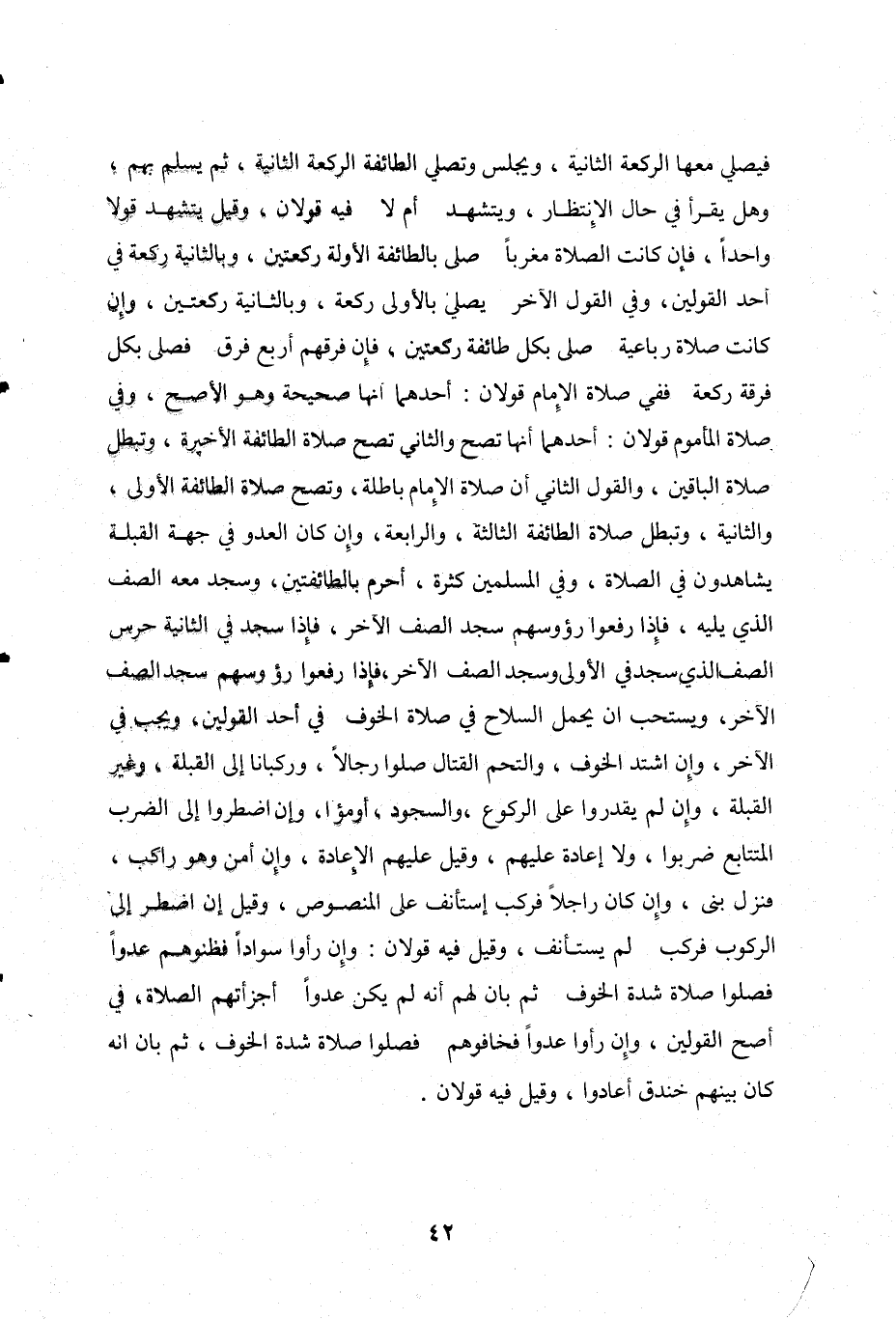 فيصلي معها الركعة الثانية ويجلس وتصلي الطائفة الركعة الثانية ثم يسلم بهم وهل يقرأ في حال الانتظار ويتشهد أم لا فيه قولان وقيل يتشهد قولا واحدا فإن كانت الصلاة مغربا صلى بالطائفة الأولة ركعتين وبالثانية ركعة في أحد القولين وفي القول الآخر يصلي بالأولى ركعة وبالثانية ركعتين وان كانت صلاة رباعية صلى بكل طائفة ركعتين فإن فرقهم أربع فرق فصلى بكل فرقة ركعة ففي صلاة الامام قولان: أحدهما أنها صحيحة وهو الأصح وفي صلاة المأموم قولان: أحدهما أنها تصح والثاني تصح صلاة الطائفة الأخيرة وتبطل صلاة الباقين والقول الثاني أن صلاة الامام باطلة وتصح صلاة الطائفة الأولى والثانية وتبطل صلاة الطائفة الثالثة والرابعة وان كان العدو في جهة القبلة يشاهدون في الصلاة وفي المسلمين كثرة أحرم بالطائقتين وسجد معه الصف الذي يليه فإذا رفعوا رؤوسهم سجد الصف الآخر فإذا سجد في الثانية حرس الصف الذي سجد في الأولى وسجد الصف الآخر فإذا رفعوا رؤوسهم سجد الصف الآخر ويستحب أن يحمل السلاح في صلاة الخوف في أحد القولين ويجب في الآخر وان اشتد الخوف والتحم القتال صلوا رجالا وركبانا الى القبلة وغير القبلة وان لم يقدروا على الركوع والسجود أومؤا وان اضطروا الى الضرب المتتابع ضربوا ولا اعادة عليهم وقيل عليهم الاعادة وان أمن وهو راكب فنزل بنى وان كان راجلا فركب استأنف على المنصوص وقيل ان اضطر الى الركوب فركب لم يستأنف وقيل فيه قولان: وان رأوا سوادا فظنوهم عدوا فصلوا صلاة شدة الخوف ثم بان لهم أنه لم يكن عدوا أجزأتهم الصلاة في أصح القولين وان رأوا عدوا فخافوهم فصلوا صلاة شدة الخوف ثم بان أنه كان بينهم خندق أعادوا وقيل فيه قولان.