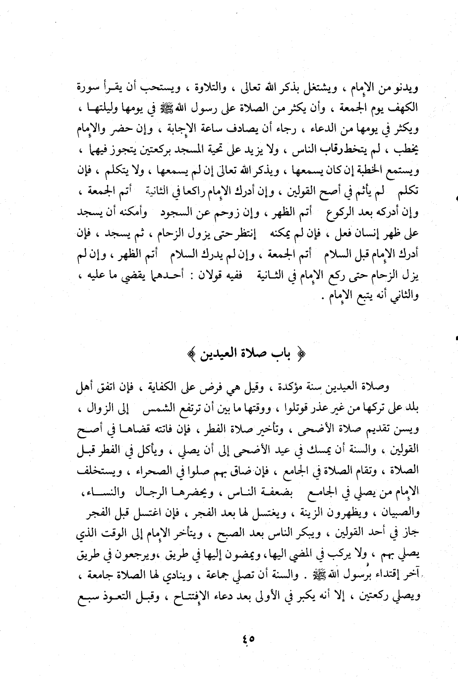وصلاة العيدين سنة مؤكدة وقيل هي فرض على الكفاية فإن اتفق أهل بلد على تركها من غير عذر قوتلوا ووقتها ما بين أن ترتفع الشمس الى الزوال ويسن تقديم صلاة الأضحى وتأخير صلاة الفطر فإن فاتته قضاها في أصح القولين والسنة أن يمسك في عيد الأضحى الى أن يصلي ويأكل في الفطر قبل الصلاة وتقام الصلاة في الجامع فإن ضاق بهم صلوا في الصحراء ويستخلف الامام من يصلي في الجامع بضعفة الناس ويحضرها الرجال والنساء والصبيان ويظهرون الزينة ويغتسل لها بعد الفجر فإن اغتسل قبل الفجر جاز في أحد القولين ويكبر الناس بعد الصبح ويتأخر الامام الى الوقت الذي يصلي بهم ولا يركب في المضي اليها ويمضون اليها في طريق ويرجعون في طريق آخر اقتداء برسول الله صلى الله عليه وسلم والسنة أن تصلي جماعة وينادي لها الصلاة جامعة ويصلي ركعتين إلا أنه يكبر في الأولى بعد دعاء الافتتاح وقبل التعوذ سبع