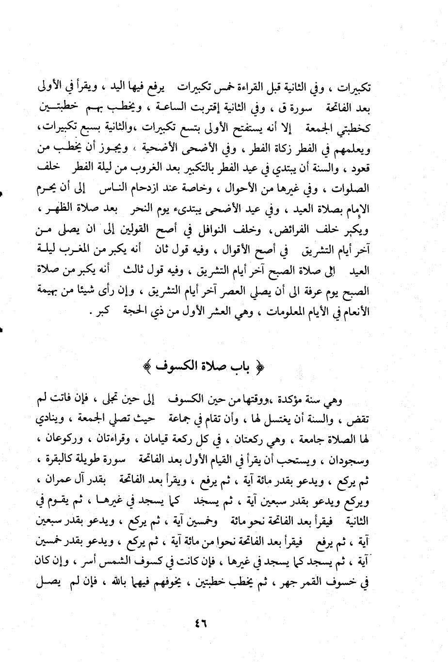 تكبيرات وفي الثانية قبل القراءة خمس تكبيرات يرفع فيها اليد ويقرأ في الأولى بعد الفاتحة سورة ق وفي الثانية اقتربت الساعة ويخطب بهم خطبتين كخطبتي الجمعة الا أنه يستفتح الأولى بتسع تكبيرات والثانية بسبع تكبيرات ويعلمهم في الفطر زكاة الفطر وفي الأضحى الأضحية ويجوز أن يخطب من قعود والسنة أن يبتدي في عيد الفطر بالتكبير بعد الغروب من ليلة الفطر خلف الصلوات وفي غيرها من الأحوال وخاصة عند ازدحام الناس الى أن يحرم الامام بصلاة العيد وفي عيد الأضحى يبتدىء يوم النحر بعد صلاة الظهر ويكبر خلف الفرائض وخلف النوافل في أصح القولين الى أن يصلي من آخر أيام التشريق في أصح الأقوال وفيه قول ثان أنه يكبر من المغرب ليلة العيد الى صلاة الصبح آخر أيام التشريق وفيه قول ثالث أنه يكبر من صلاة الصبح يوم عرفة الى أن يصلي العصر آخر أيام التشريق فإن رأى شيئا من بهيمة الأنعام في الأيام المعلومات وهي العشر الأول من ذي الحجة كبر.