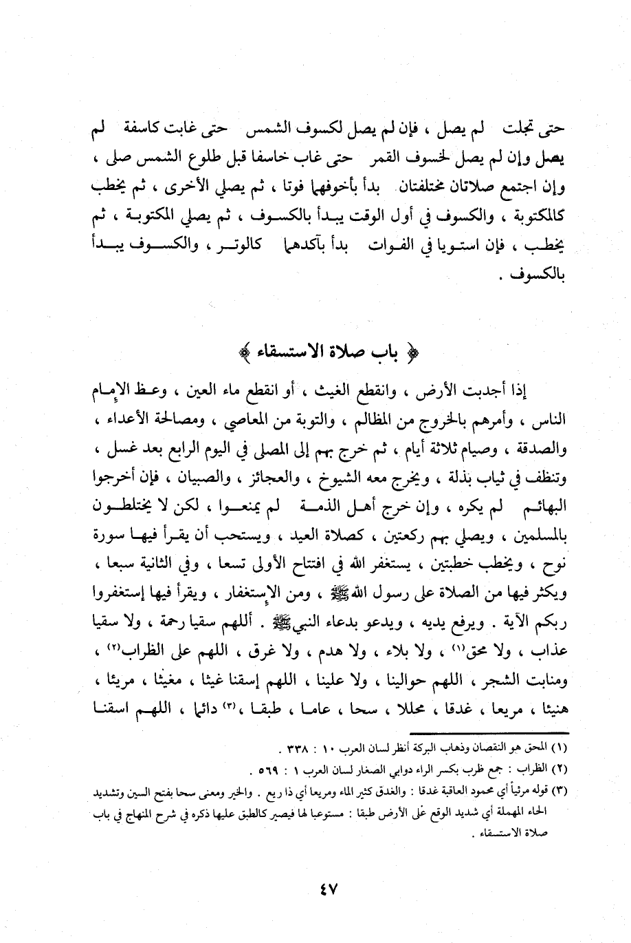 اذا أجدبت الأرض وانقطع الغيث, أو انقطع ماء العين, وعظ الامام الناس وأمرهم بالخروج من المظالم والتوبة من المعاصي ومصالحة الأعداء والصدقة, وصيام ثلاثة أيام ثم خرج بهم الى المصلى في اليوم الرابع بعد غسل وتنظف في ثياب بذلة ويخرج معه الشيوخ والعجائز والصبيان, فان أخرجوا البهائم لم يكره وان خرج أهل الذمة لم يمنعوا لكن لا يختلطون بالمسلمين ويصلى بهم ركعتين كصلاة العيد ويستحب أن يقرأ فيها سورة نوح ويخطب خطبتين يستغفر الله في افتتاح الأولى تسعا وفي الثانية سبعا ويكثر فيها من الصلاة على رسول الله صلى الله عليه وسلم ومن الاستغفار ويقرأ فيها استغفروا ربكم الآية ويرفع يديه ويدعو بدعاء النبي صلى الله عليه وسلم اللهم سقيا رحمة ولا سقيا عذاب ولا محق1 ولا بلاء ولا هدم ولا غرق اللهم على الظراب2 ومنابت الشجر اللهم حوالينا ولا علينا اللهم اسقنا غيثا مغيثا مريئا هنيئا مريعا غدقا محللا سحا عاما طبقا,3 دائما اللهم اسقنا