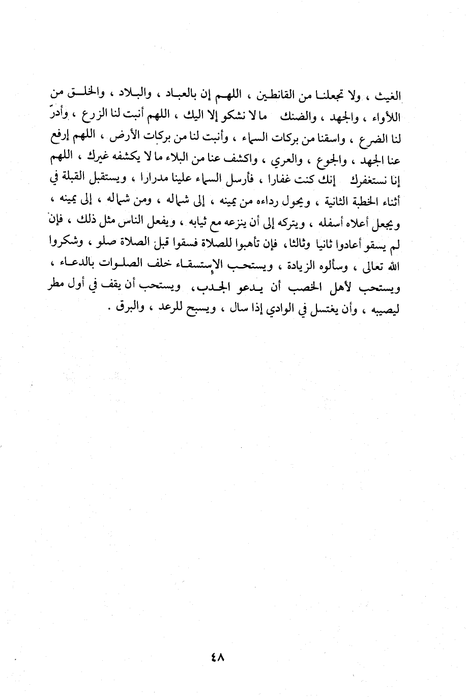الغيث ولا تجعلنا من القانطين اللهم ان بالعباد والبلاد والخلق من اللأواء والجهد والضنك ما لا نشكو الا اليك اللهم أنبت لنا الزرع وأدر لنا الضرع واسقنا من بركات السماء وأنبت لنا من بركات الأرض اللهم ارفع عنا الجهد والجوع والعري واكشف عنا من البلاء ما لا يكشفه غيرك اللهم انا نستغفرك انك كنت غفارا فأرسل السماء علينا مدرارا ويستقبل القبلة في أثناء الخطبة الثانية ويحول رداءه من يمينه الى شماله ومن شماله الى يمينه ويجعل أعلاه أسفله ويتركه الى أن ينزعه مع ثيابه ويفعل الناس مثل ذلك فإن لم يسقو أعادوا ثانية وثالثا فإن تأهبوا للصلاة فسقوا قبل الصلاة صلو وشكروا الله تعالى وسألوه الزيادة ويستحب الاستسقاء خلف الصلوات بالدعاء ويستحب لأهل الخصب أن يدعو الجدب ويستحب أن يقف في أول مطر ليصيبه وأن يغتسل في الوادي اذا سال ويسبح للرعد والبرق.